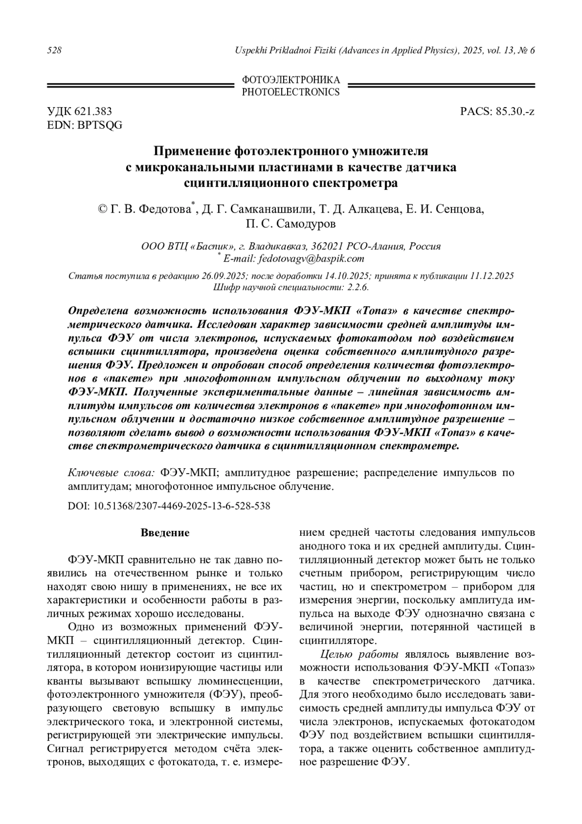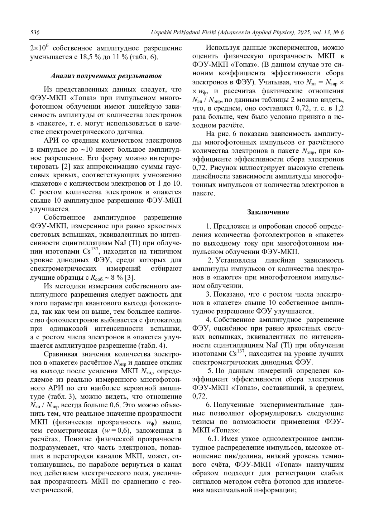 Определена возможность использования ФЭУ-МКП «Топаз» в качестве спектрометрического датчика. Исследован характер зависимости средней амплитуды импульса ФЭУ от числа электронов, испускаемых фотокатодом под воздействием вспышки сцинтиллятора, произведена оценка собственного амплитудного разрешения ФЭУ. Предложен и опробован способ определения количества фотоэлектронов в «пакете» при многофотонном импульсном облучении по выходному току ФЭУ-МКП. Полученные экспериментальные данные – линейная зависимость амплитуды импульсов от количества электронов в «пакете» при многофотонном импульсном облучении и достаточно низкое собственное амплитудное разрешение – позволяют сделать вывод о возможности использования ФЭУ-МКП «Топаз» в качестве спектрометрического датчика в сцинтилляционном спектрометре.