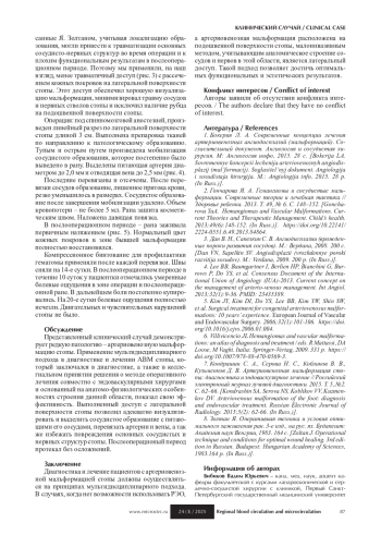 7. Кондрашин С. А., Серова Н. С., Кобликов В. В., Кузьменков Д. В. Артериовенозная мальформация стопы: диагностика и эндоваскулярное лечение // Российский электронный журнал лучевой диагностики. 2015. Т. 5, №2. С. 62-66.