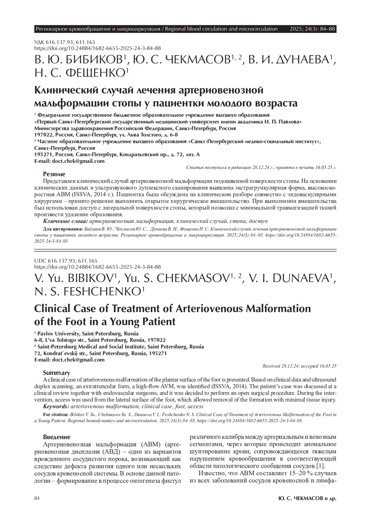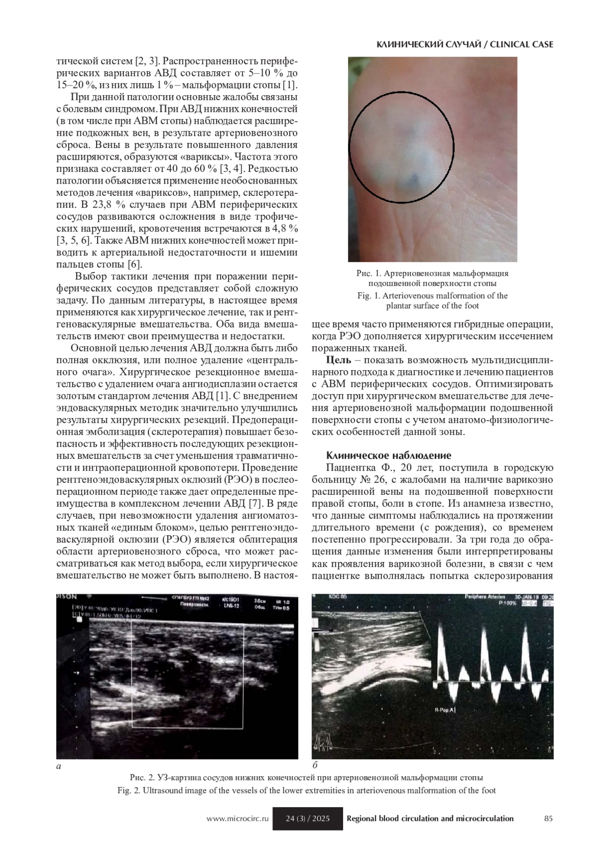 Представлен клинический случай артериовенозной мальформации подошвенной поверхности стопы. На основании клинических данных и ультразвукового дуплексного сканирования выявлена экстратрункулярная форма, высокоскоростная АВМ (ISSVA, 2014 г.). Пациентка была обсуждена на клиническом разборе совместно с эндоваскулярными хирургами – принято решение выполнить открытое хирургическое вмешательство. При выполнении вмешательства был использован доступ с латеральной поверхности стопы, который позволил с минимальной травматизацией тканей произвести удаление образования.