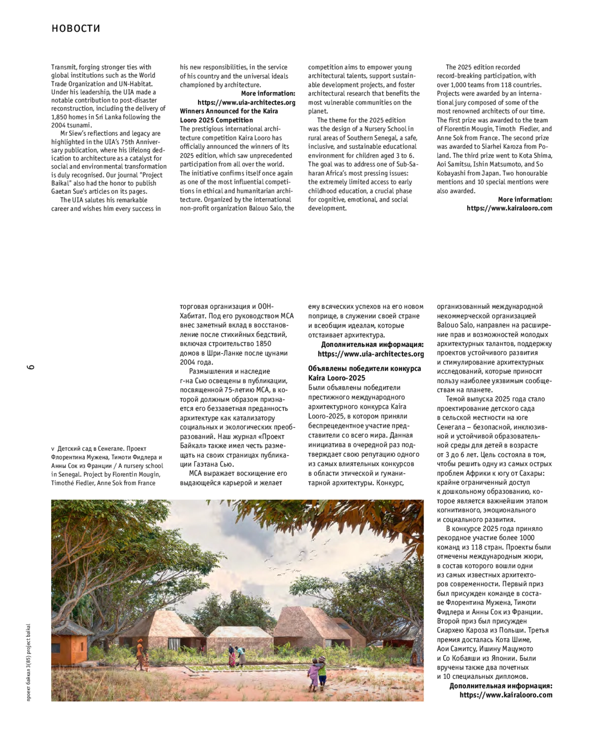 В разделе новостей говорится о теме Всемирного дня архитектуры 2025 года, назначении бывшего президента МСА Гаэтана Сью послом Маврикия в Китае, а также представлены победители конкурса Kaira Looro-2025.