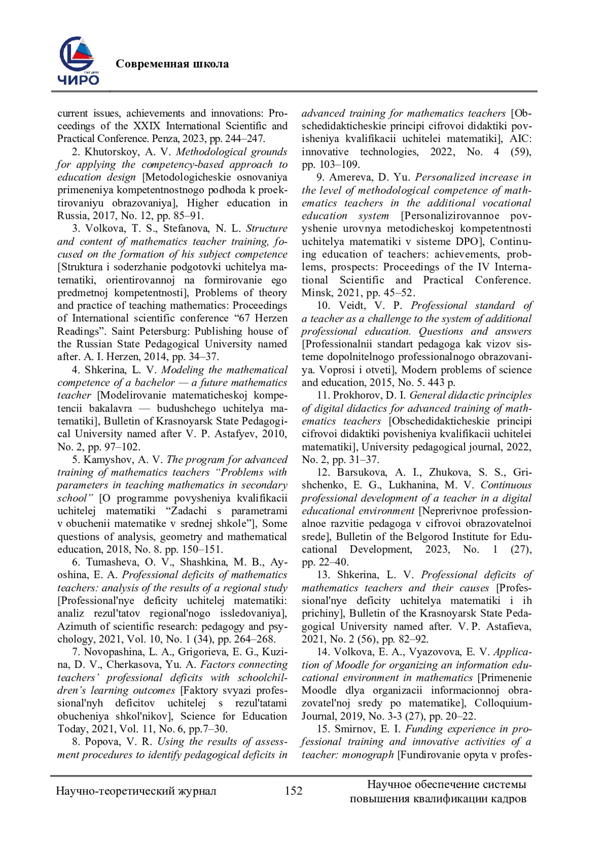 13. Шкерина, Л. В. Профессиональные дефициты учителя математики и их причины / Л. В. Шкерина. - Текст: непосредственный // Вестник Красноярского государственного педагогического университета им. В. П. Астафьева. - 2021. - № 2 (56). - С. 82-92. EDN: GYCMZN