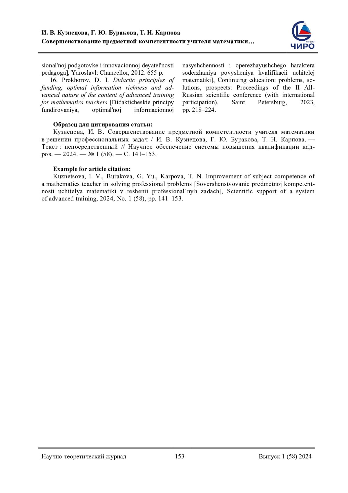16. Прохоров, Д. И. Дидактические принципы фундирования, оптимальной информационной насыщенности и опережающего характера содержания повышения квалификации учителей математики / Д. И. Прохоров. - Текст: непосредственный // Непрерывное образование: проблемы, решения, перспективы: материалы II Всероссийской научной конференции (с международным участием). - Санкт-Петербург, 2023. - С. 218-224. EDN: TLVSTI