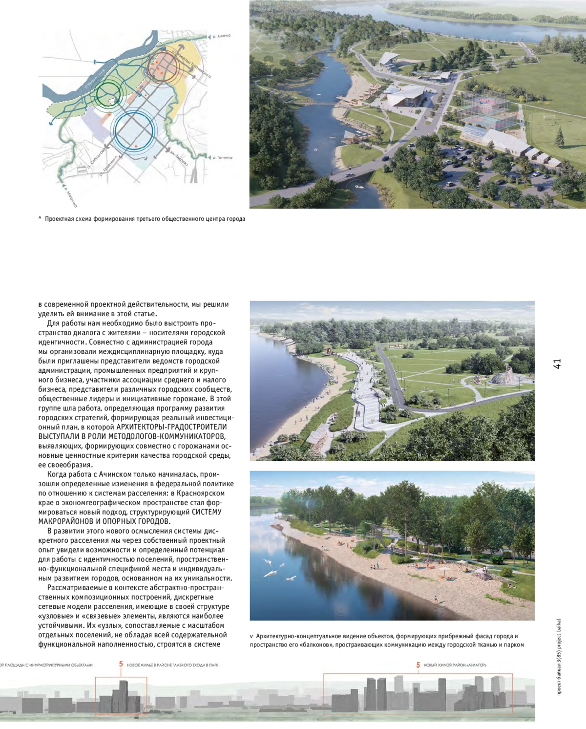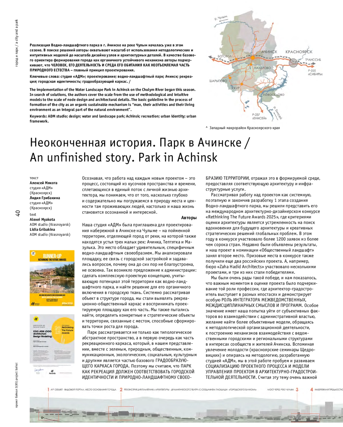 Реализация Водно-ландшафтного парка в г. Ачинске на реке Чулым началась уже в этом сезоне. В поиске решений авторы охватывают масштаб от использования методологических и интуитивных моделей до масштаба дизайна узлов и архитектурных деталей. В качестве базового ориентира формирования города как органичного устойчивого механизма авторы подчер кивают, что ЧЕЛОВЕК, ЕГО ДЕЯТЕЛЬНОСТЬ И СРЕДА ЕГО ОБИТАНИЯ КАК НЕОТЪЕМЛЕМАЯ ЧАСТЬ ПРИРОДНОГО ЕСТЕСТВА - главный принцип проектирования.