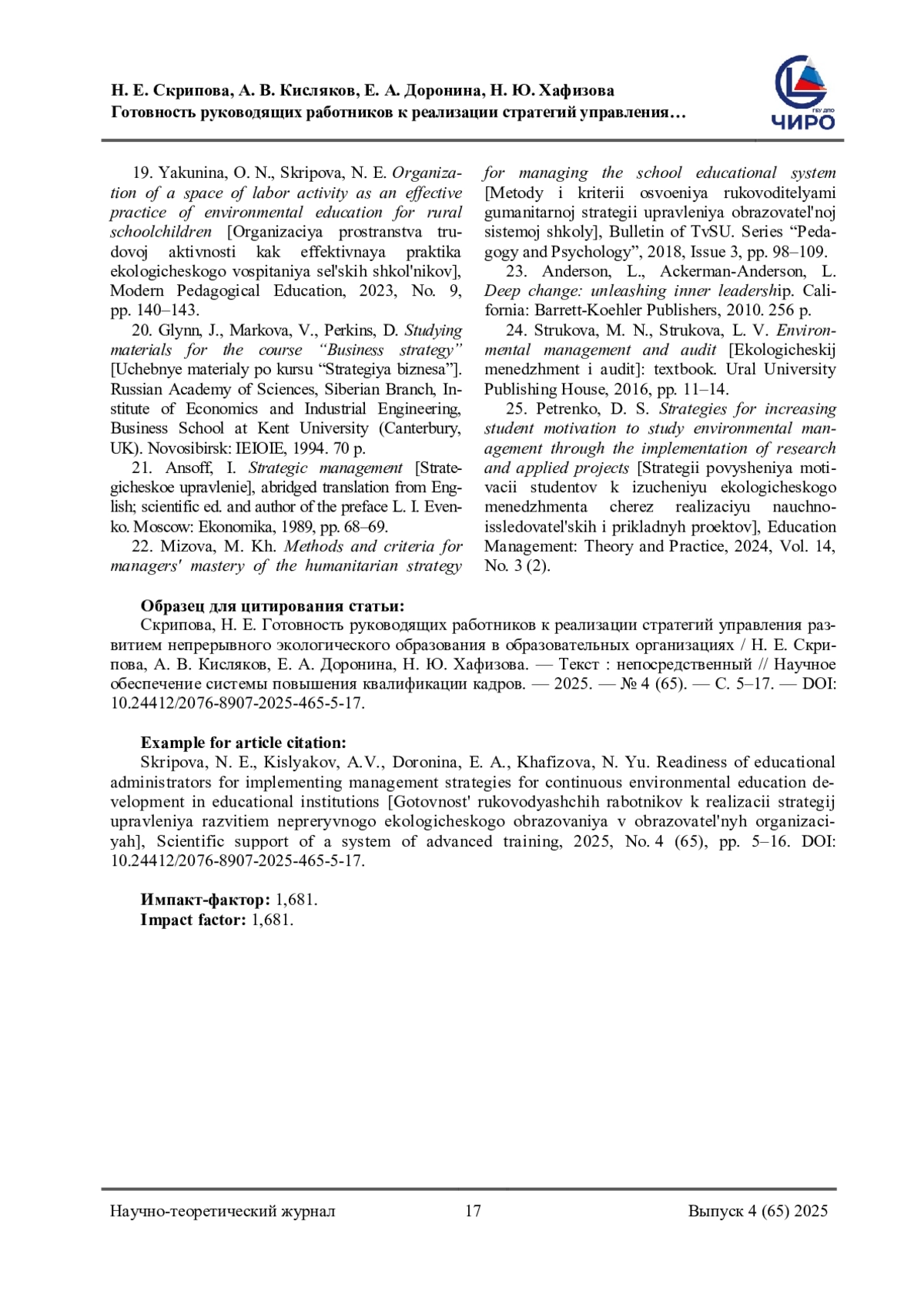 17. Скрипова, Н. Е. К вопросу о значимости экологизации общего образования / Н. Е. Скрипова, Д. Ф. Ильясов. - Текст : непосредственный // Современное педагогическое образование. - 2023. - № 12. - С. 139-144.