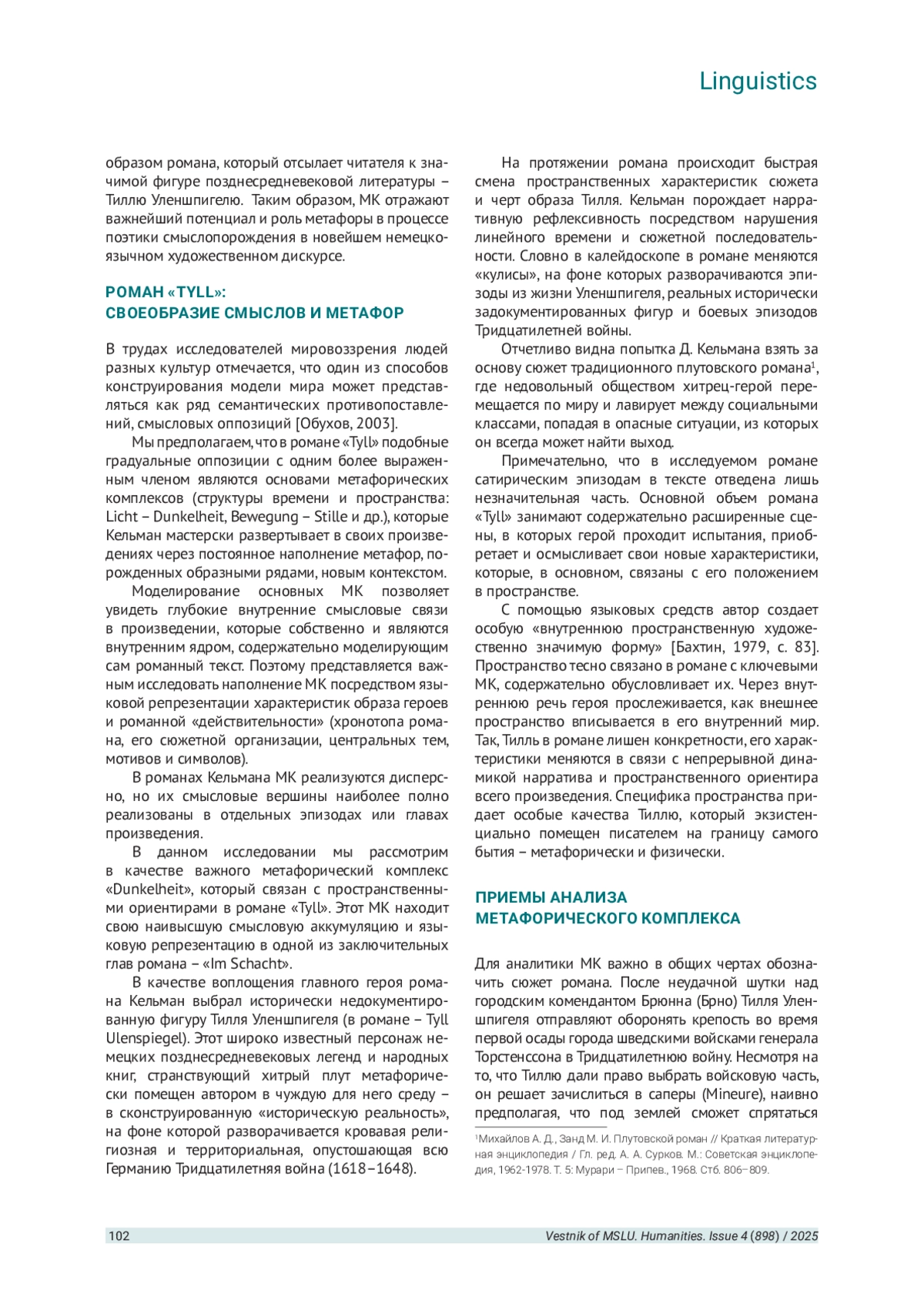 6. Сударева В. С. Функции и специфика метафорических комплексов в романе Д. Кельмана “Tyll” // Вестник Самарского университета. История, педагогика, филология. 2024. Т. 30. № 3. C. 187-194. EDN: SKWEXC