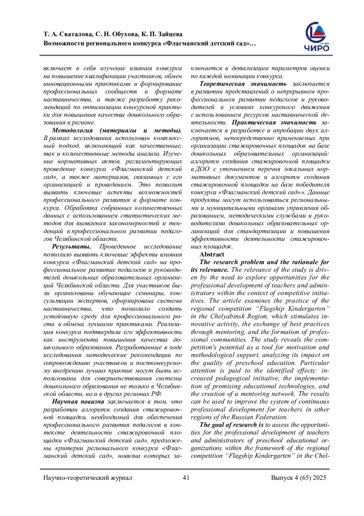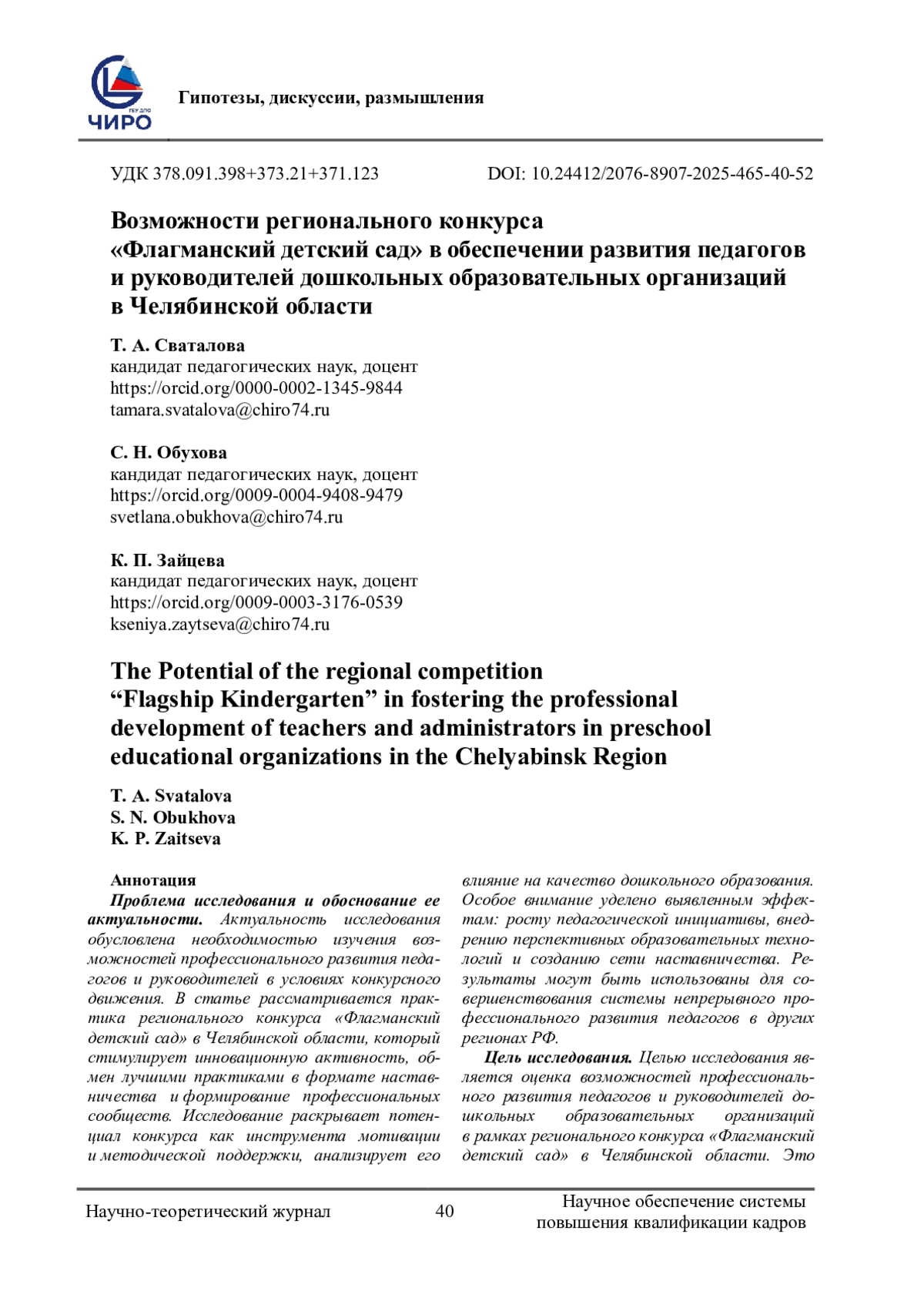 Проблема исследования и обоснование ее актуальности. Актуальность исследования обусловлена необходимостью изучения возможностей профессионального развития педагогов и руководителей в условиях конкурсного движения. В статье рассматривается практика регионального конкурса «Флагманский детский сад» в Челябинской области, который стимулирует инновационную активность, обмен лучшими практиками в формате наставничества и формирование профессиональных сообществ. Исследование раскрывает потенциал конкурса как инструмента мотивации и методической поддержки, анализирует его влияние на качество дошкольного образования. Особое внимание уделено выявленным эффектам: росту педагогической инициативы, внедрению перспективных образовательных технологий и созданию сети наставничества. Результаты могут быть использованы для совершенствования системы непрерывного профессионального развития педагогов в других регионах РФ. Цель исследования. Целью исследования является оценка возможностей профессионального развития педагогов и руководителей дошкольных образовательных организаций в рамках регионального конкурса «Флагманский детский сад» в Челябинской области. Это включает в себя изучение влияния конкурса на повышение квалификации участников, обмен инновационными практиками и формирование профессиональных сообществ в формате наставничества, а также разработку рекомендаций по оптимизации конкурсной практики для повышения качества дошкольного образования в регионе. Методология (материалы и методы). В рамках исследования использован комплексный подход, включающий как качественные, так и количественные методы анализа. Изучение нормативных актов, регламентирующих проведение конкурса «Флагманский детский сад», а также материалов, связанных с его организацией и проведением. Это позволит выявить ключевые аспекты возможностей профессионального развития в формате конкурса. Обработка собранных количественных данных с использованием статистических методов для выявления закономерностей и тенденций в профессиональном развитии педагогов Челябинской области. Результаты. Проведенное исследование позволило выявить ключевые эффекты влияния конкурса «Флагманский детский сад» на профессиональное развитие педагогов и руководителей дошкольных образовательных организаций Челябинской области. Для участников были организованы обучающие семинары, консультации экспертов, сформирована система наставничества, что позволило создать устойчивую среду для профессионального роста и обмена лучшими практиками. Реализация конкурса подтвердила его эффективность как инструмента повышения качества дошкольного образования. Разработанные в ходе исследования методические рекомендации по сопровождению участников и постконкурсному внедрению лучших практик могут быть использованы для совершенствования системы дошкольного образования не только в Челябинской области, но и в других регионах РФ. Научная новизна заключается в том, что разработан алгоритм создания стажировочной площадки, необходимый для обеспечения профессионального развития педагогов в контексте деятельности стажировочной площадки «Флагманский детский сад», предложены критерии регионального конкурса «Флагманский детский сад», новизна которых зак