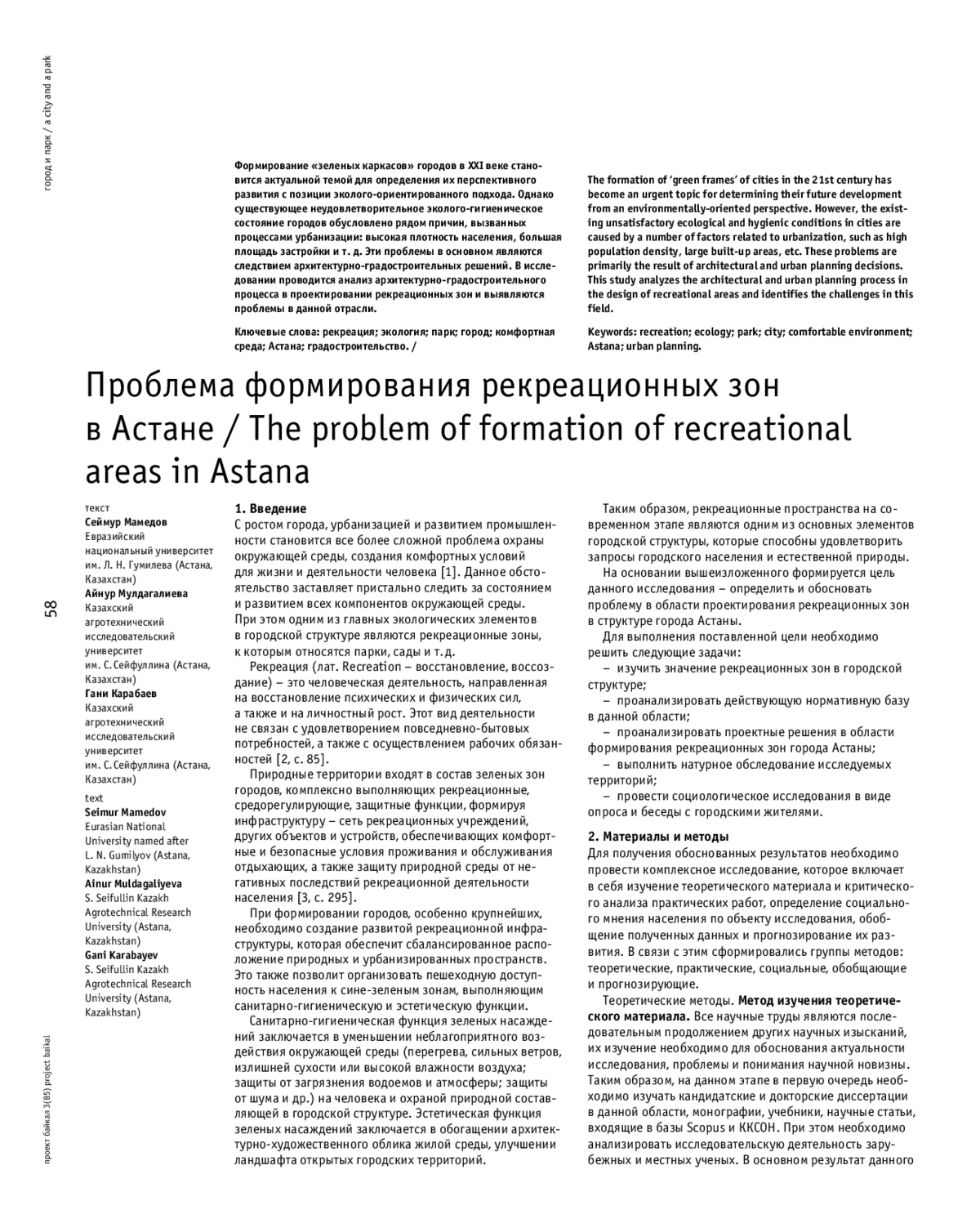 Формирование «зеленых каркасов» городов в XXI веке становится актуальной темой для определения их перспективного развития с позиции эколого-ориентированного подхода. Однако существующее неудовлетворительное эколого-гигиеническое состояние городов обусловлено рядом причин, вызванных процессами урбанизации: высокая плотность населения, большая площадь застройки и т. д. Эти проблемы в основном являются следствием архитектурно-градостроительных решений. В исследовании проводится анализ архитектурно-градостроительного процесса в проектировании рекреационных зон и выявляются проблемы в данной отрасли.