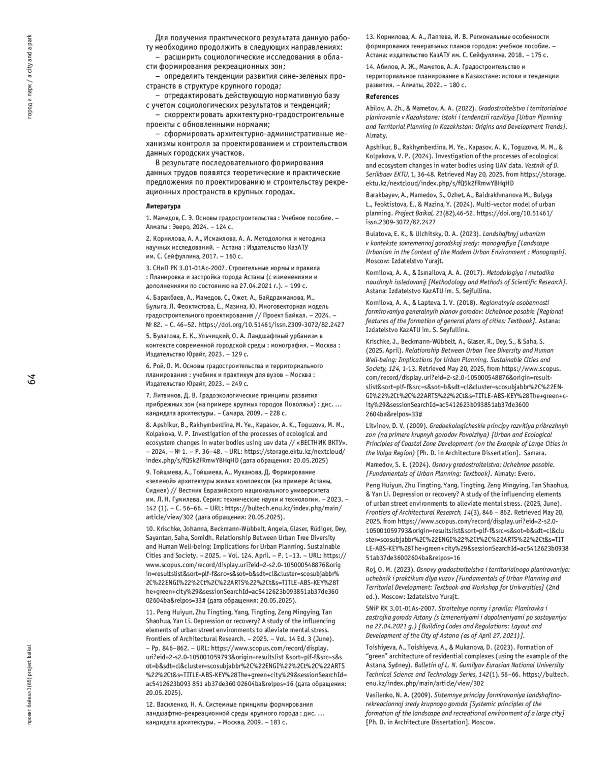 11. Peng Huiyun, Zhu Tingting, Yang, Tingting, Zeng Mingying, Tan Shaohua, Yan Li. Depression or recovery? A study of the influencing elements of urban street environments to alleviate mental stress. Frontiers of Architectural Research. - 2025. - Vol. 14 Ed. 3 (June). - Pp. 846-862. - URL: https://www.scopus.com/record/display.uri?eid=2-s2.0-105001059793&origin=resultslist&sort=plf-f&src=s&sot=b&sdt=cl&cluster=scosubjabbr%2C%22ENGI%22%2Ct%2C%22ARTS%22%2Ct&s=TITLE-ABS-KEY%28The+green+city%29&sessionSearchId=ac5412623b093851ab37de36002604ba&relpos=16 (дата обращения: 20.05.2025).