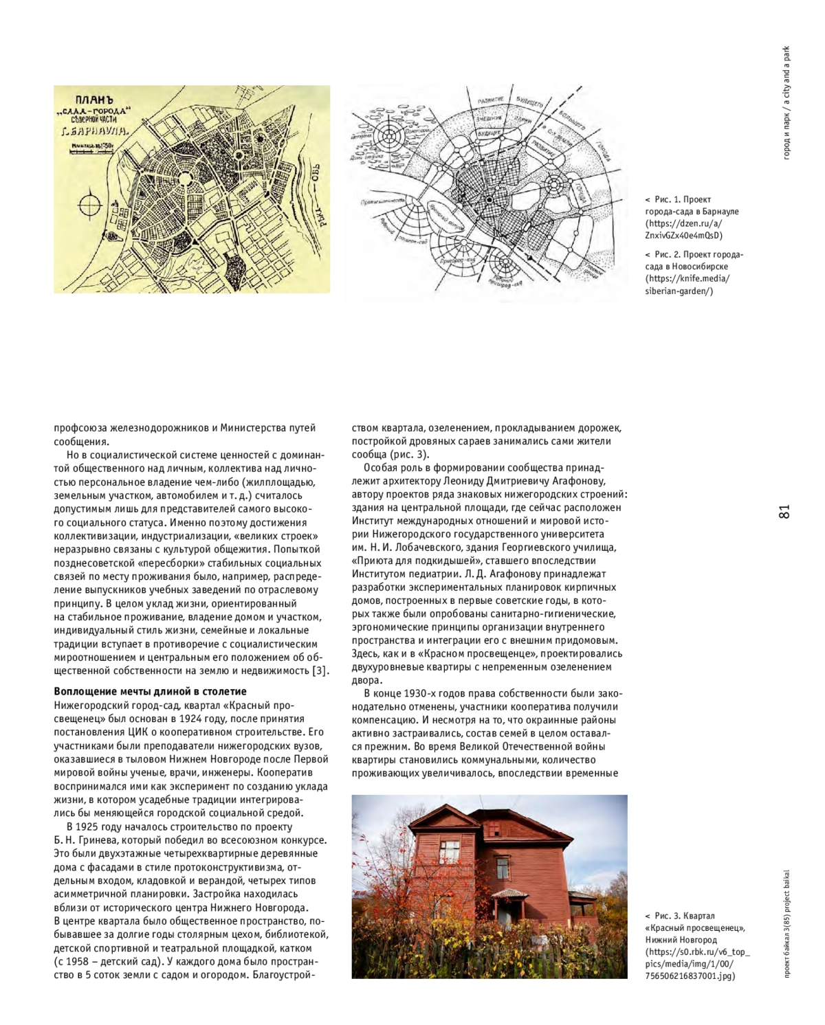 Рассматривается феномен городского европейского сада, выявляется его символическое и социально-нормативное содержание, взаимосвязь общественной системы, модели взаимодействия человека с миром и социумом в урбанистическом дискурсе. Дается анализ социально-утопической концепции города-сада Э. Говарда как общественного движения, градостроительной практики и метода социального реформирования. На основе материалов о принципах создания, истории развития и современном положении нижегородского города-сада «Красный просвещенец» раскрывается исследовательский, общественный и культурный потенциал данного объекта для развития города.