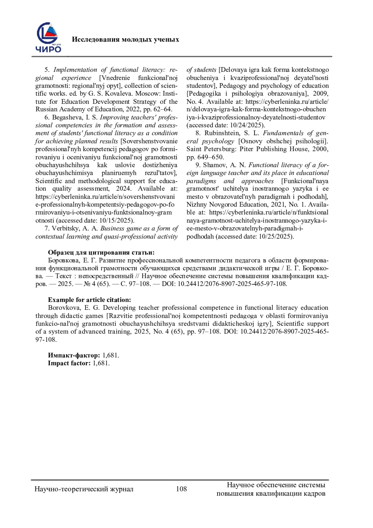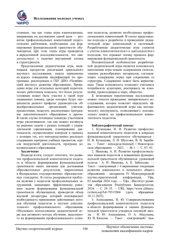 6. Бегашева, И. С. Совершенствование профессиональных компетенций педагогов по формированию и оцениванию функциональной грамотности обучающихся как условие достижения обучающимися планируемых результатов / И. С. Бегашева. - Текст : электронный // Научно-методическое обеспечение оценки качества образования. - 2024. - URL: https://cyberleninka.ru/article/n/sovershenstvovanie-professionalnyh-kompetentsiy-pedagogov-po-formirovaniyu-i-otsenivaniyu-funktsionalnoy-gramotnosti (дата обращения: 15.10.2025).