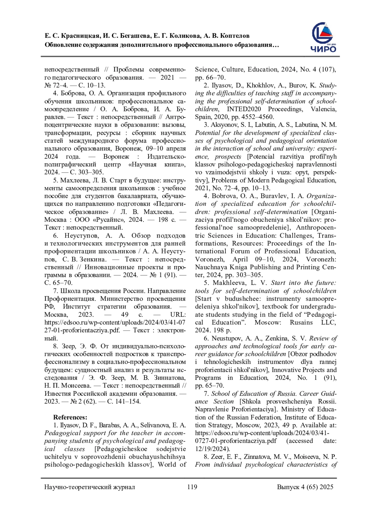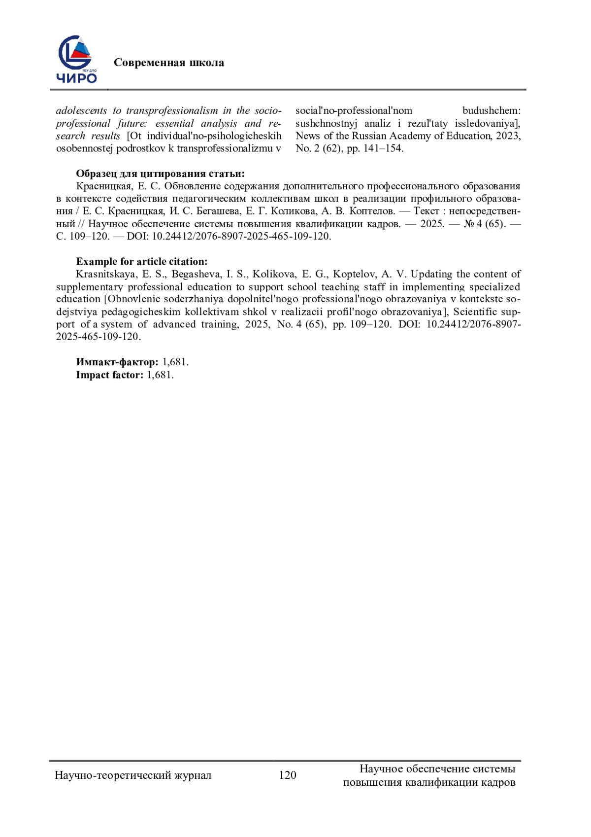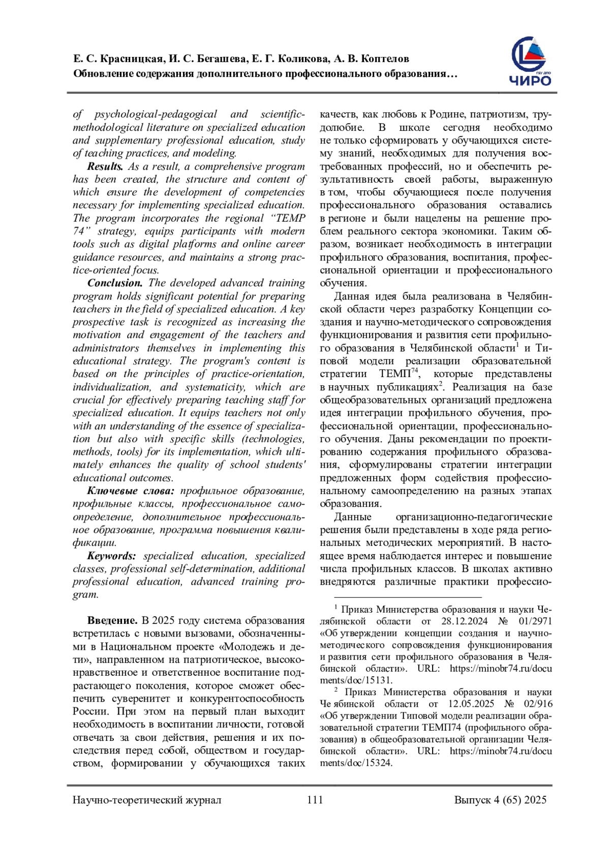КРАСНИЦКАЯ Е. С., БЕГАШЕВА И. С., КОЛИКОВА Е. Г., КОПТЕЛОВ А. В. ОБНОВЛЕНИЕ СОДЕРЖАНИЯ ДОПОЛНИТЕЛЬНОГО ПРОФЕССИОНАЛЬНОГО ОБРАЗОВАНИЯ В КОНТЕКСТЕ СОДЕЙСТВИЯ ПЕДАГОГИЧЕСКИМ КОЛЛЕКТИВАМ ШКОЛ В РЕАЛИЗАЦИИ ПРОФИЛЬНОГО ОБРАЗОВАНИЯ // НАУЧНОЕ ОБЕСПЕЧЕНИЕ СИСТЕМЫ ПОВЫШЕНИЯ КВАЛИФИКАЦИИ КАДРОВ. 2025. № 4 (65) (14 СТ.)