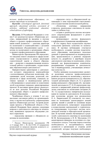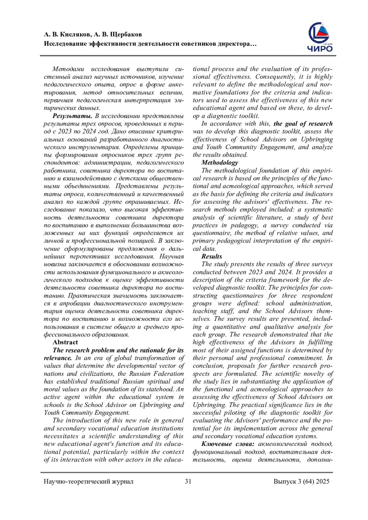Проблема исследования и обоснование ее актуальности. В период глобальной трансформации ценностей, определяющих вектор развития государств и цивилизации, Российская Федерация определила в качестве основ своей государственности российские традиционные духовно-нравственные ценности. Активным субъектом системы воспитания в образовательных организациях является советник директора по воспитанию и взаимодействию с детскими общественными объединениями. Появление новой должности в организациях общего и среднего профессионального образования актуализирует необходимость научного осмысления роли нового субъекта воспитания, его воспитательного потенциала, в условиях взаимодействия с другими субъектами воспитательной деятельности, оценки его профессиональной деятельности. Следовательно, актуальным является определение методологических и нормативных оснований критериев и показателей оценки эффективности деятельности нового субъекта воспитания и на их основе разработки диагностического инструментария. В соответствии с этим цель исследования - разработка диагностического инструментария и оценка эффективности деятельности советника директора по воспитанию и взаимодействию с детскими общественными объединениями, анализ полученных результатов. Методология (материалы и методы). Методологической основой проведенного эмпирического исследования являются идеи функционального и акмеологического подходов, послужившие основой для определения критериев и показателей оценки эффективности деятельности советника по воспитанию. Методами исследования выступили системный анализ научных источников, изучение педагогического опыта, опрос в форме анкетирования, метод относительных величин, первичная педагогическая интерпретация эмпирических данных. Результаты. В исследовании представлены результаты трех опросов, проведенных в период с 2023 по 2024 год. Дано описание критериальных оснований разработанного диагностического инструментария. Определены принципы формирования опросников трех групп респондентов: администрации, педагогического работника, советника директора по воспитанию и взаимодействию с детскими общественными объединениями. Представлены результаты опроса, количественный и качественный анализ по каждой группе опрашиваемых. Исследование показало, что высокая эффективность деятельности советника директора по воспитанию в выполнении большинства возложенных на них функций определяется их личной и профессиональной позицией. В заключение сформулированы предложения о дальнейших перспективах исследования. Научная новизна заключается в обосновании возможности использования функционального и акмеологического подходов к оценке эффективности деятельности советника директора по воспитанию. Практическая значимость заключается в апробации диагностического инструментария оценки деятельности советника директора по воспитанию и возможности его использования в системе общего и среднего профессионального образования.
