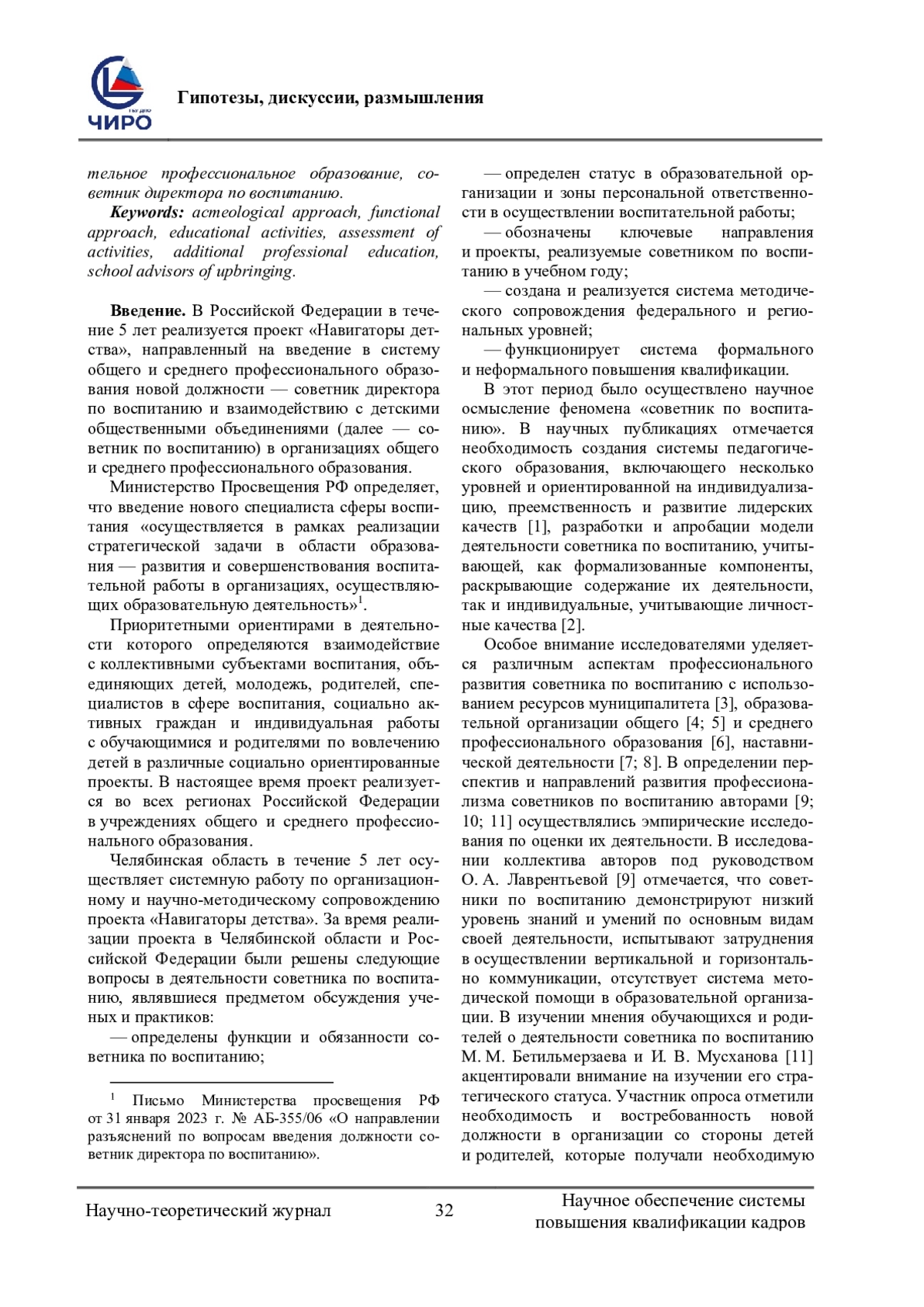 9. Лаврентьева, О. А. Деятельность советника директора по воспитанию и взаимодействию с детскими общественными организациями: оценка ожиданий и потенциала совершенствования воспитательной работы с обучающимися / О. А. Лаврентьева, Е. М. Скрыпникова, Б. А. Дейч, З. И. Лаврентьева. - Текст: непосредственный // Science for Education Today. - 2023. - Т. 1, № 6. - С. 7-36. EDN: MIOVXH