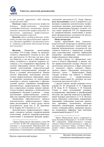Изменения, происходящие в условиях VUCA-мира, влияют на жизнедеятельность современного человека во всех сферах деятельности [1]. Поэтому для всех структур общества, в том числе и образования, возникает потребность в развитии кадрового потенциала, в его непрерывном образовании.