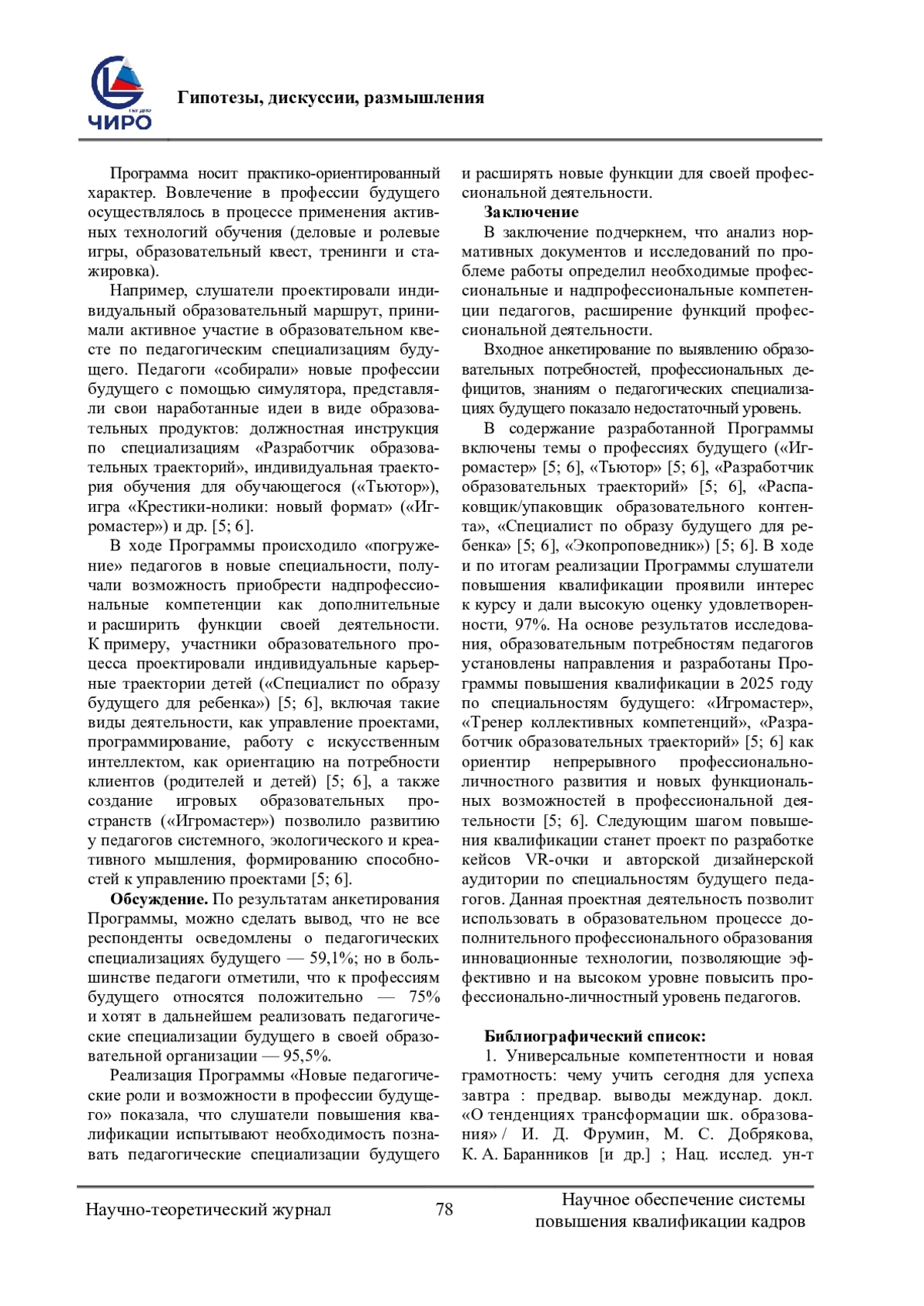 Проблема исследования и обоснование ее актуальности. Автор статьи определяет изменения, происходящие в современном мире, и соотносит с требованиями к педагогам, к их профессионально-личностному развитию. В статье рассматриваются педагогические специализации будущего в качестве важного элемента содержания непрерывного профессионально-личностного развития педагогов в образовательном процессе дополнительного профессионального образования как инновационный подход в повышении квалификации. Цель исследования состоит в разработке и реализации содержания дополнительных профессиональных программ, включающих педагогические специализации будущего согласно «Атласу новых профессий 3.0». Методология (методы и материалы). В процессе исследования осуществлялись анализ нормативно-правовых актов, научных трудов, посвященных рассматриваемой тематикой, анкетирование по выявлению образовательных потребностей, сбор и обработка данных по теме исследования. В исследовании применялись компетентностный, деятельностный, личностно ориентированный подходы. Результаты исследования. В исследовании приведены результаты как на теоретическом, так и на практическом уровне. Расширение функциональных возможностей деятельности по специальностям будущего, указанным в «Атласе новых профессий 3.0» как необходимое условие на сегодняшний день в рамках реализации дополнительных профессиональных программ, позволяет совершенствовать профессиональные и личностные, а также развивать надпрофессиональные компетенции.