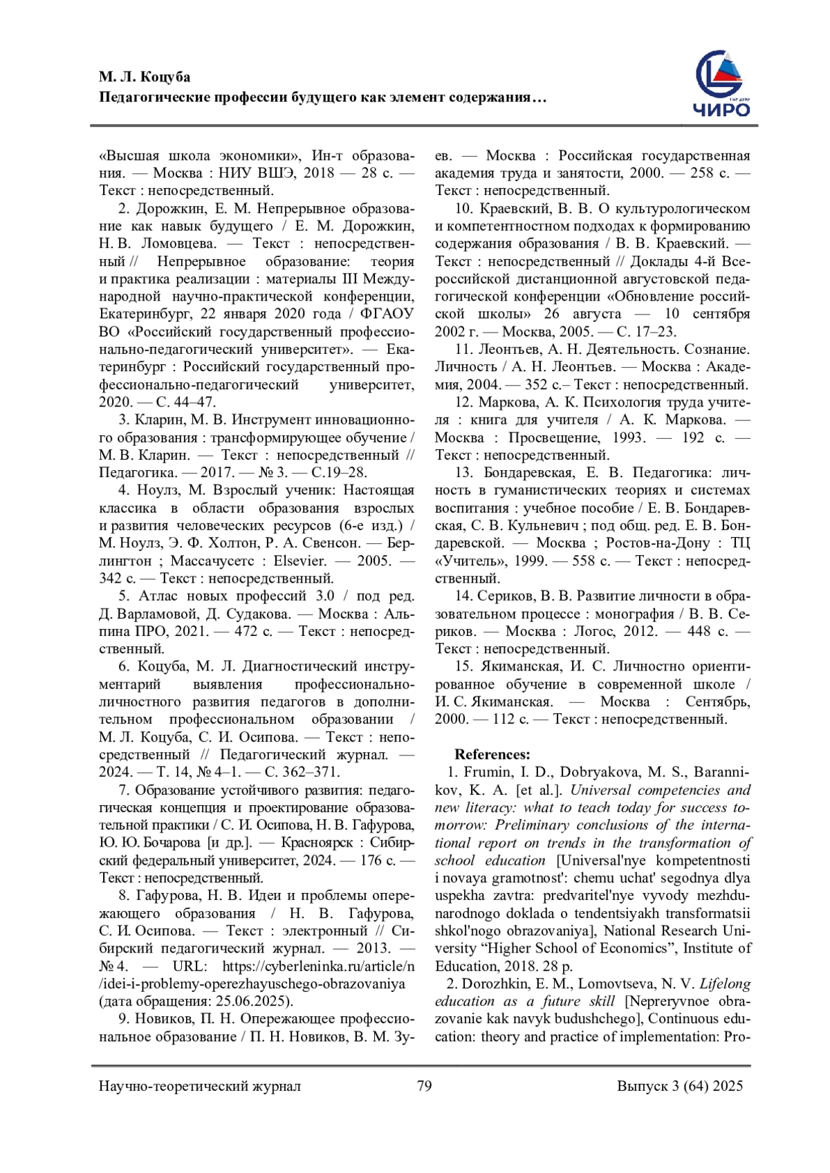 6. Коцуба, М. Л. Диагностический инструментарий выявления профессионально-личностного развития педагогов в дополнительном профессиональном образовании / М. Л. Коцуба, С. И. Осипова. - Текст: непосредственный // Педагогический журнал. - 2024. - Т. 14, № 4-1. - С. 362-371. EDN: OKURUG