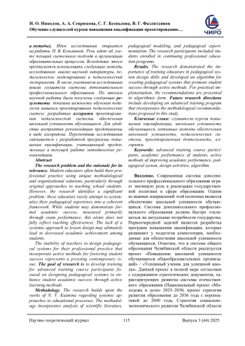 Проблема исследования и обоснование ее актуальности. Современные педагоги достаточно часто выстраивают свою профессиональную деятельность с опорой на уникальные методические и организационные решения. Речь идет об авторских подходах к обучению школьников. Вместе с тем проблема состоит в том, что они не предпринимают попыток по обобщению своего педагогического опыта до целостной системы. Данный факт, несмотря на формальные успехи обучающихся, может негативно сказаться на эффективности учебного процесса. Под формальными успехами подразумевается результативная сдача экзаменов. Вместе с тем учебная успешность сегодня не является исчерпывающим признаком эффективной деятельности учителя. Отсутствие в деятельности педагога системного подхода к проведению учебных занятий может привести к снижению школьной успешности обучающихся. Неумение педагогов проектировать педагогическую систему обеспечения школьной успешности является актуальной проблемой. В связи с этим ставится цель исследования, которая связывается с обучением слушателей курсов повышения квалификации проектированию педагогической системы обеспечения школьной успешности обучающихся. Методология (материалы и методы). Идея исследования опирается на работы Н. В. Кузьминой. Речь идет об учете позиций системного подхода в организации образовательных процессов. Вследствие этого предлагается использовать следующие методы исследования: анализ научной литературы, педагогическое моделирование и педагогический эксперимент. В число участников исследования вошли слушатели системы дополнительного профессионального образования. По итогам научной работы были получены следующие результаты: доказана важность обучения педагогов навыкам проектирования педагогических систем; разработан алгоритм проектирования педагогической системы обеспечения школьной успешности обучающихся. Для удобства восприятия рекомендации представлены в виде алгоритма. Перспектива исследования связывается с разработкой программы повышения квалификации, учитывающей предложенные в текущей работе методические рекомендации.