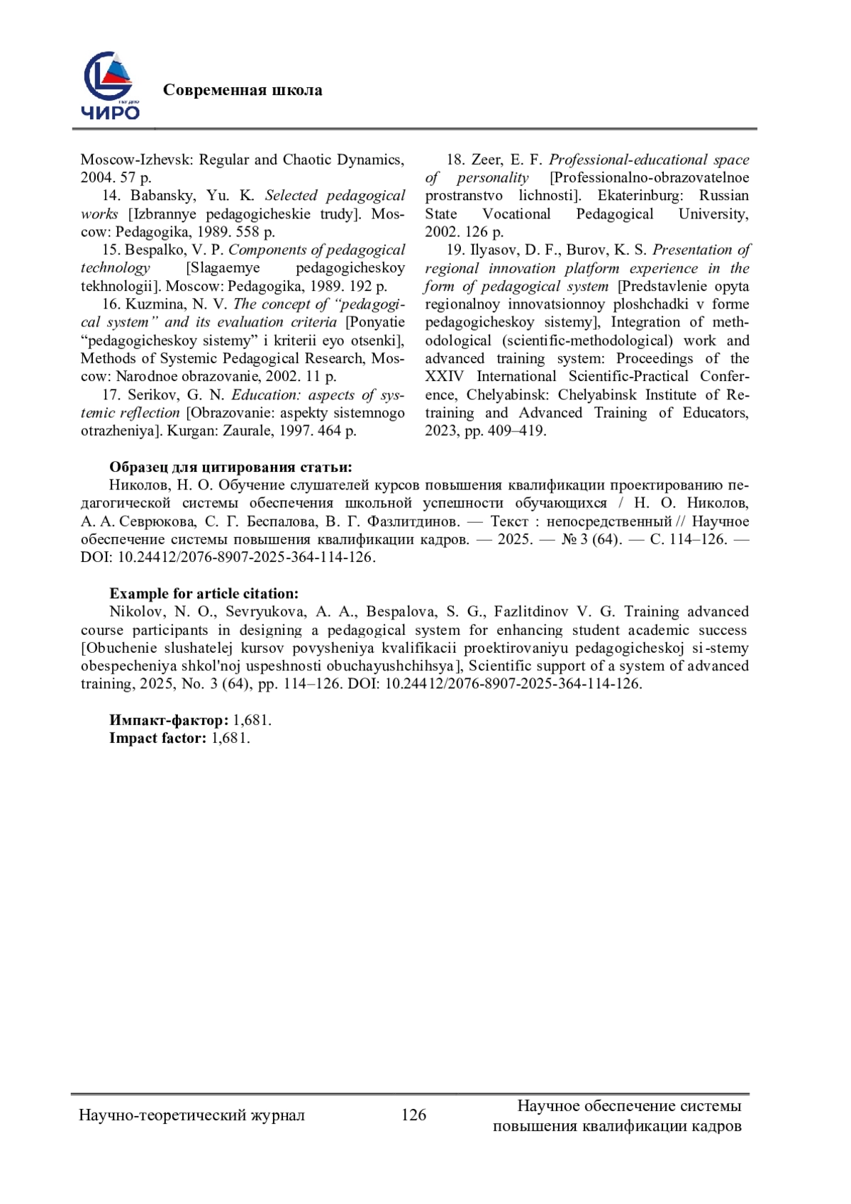 16. Кузьмина, Н. В. Понятие “педагогической системы” и критерии ее оценки / Н. В. Кузьмина. - Текст: непосредственный // Методы системного педагогического исследования / под ред. Н. В. Кузьминой. - Москва: Народное образование, 2002. - С. 11. EDN: WRPBHA