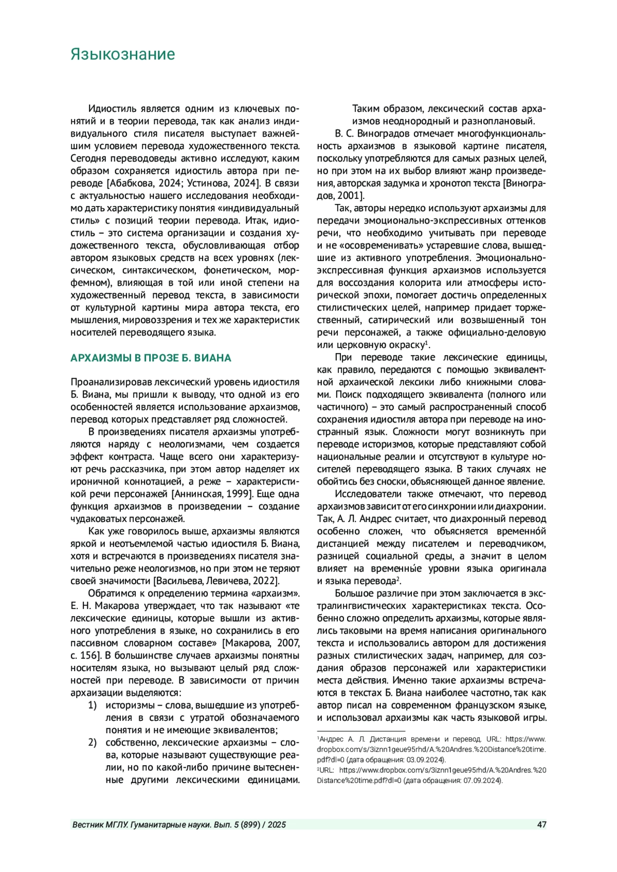 ГРУШЕВСКАЯ Т. М., ГРУШЕВСКАЯ Е. С. ОСОБЕННОСТИ ПЕРЕВОДА АРХАИЗМОВ В ХУДОЖЕСТВЕННОМ ТЕКСТЕ (НА МАТЕРИАЛЕ ФРАНЦУЗСКОЙ ЛИТЕРАТУРЫ XX ВЕКА) // ВЕСТНИК МОСКОВСКОГО ГОСУДАРСТВЕННОГО ЛИНГВИСТИЧЕСКОГО УНИВЕРСИТЕТА. ГУМАНИТАРНЫЕ НАУКИ. 2025. № 5 (899)