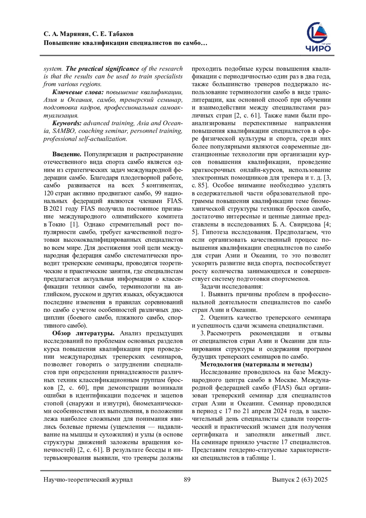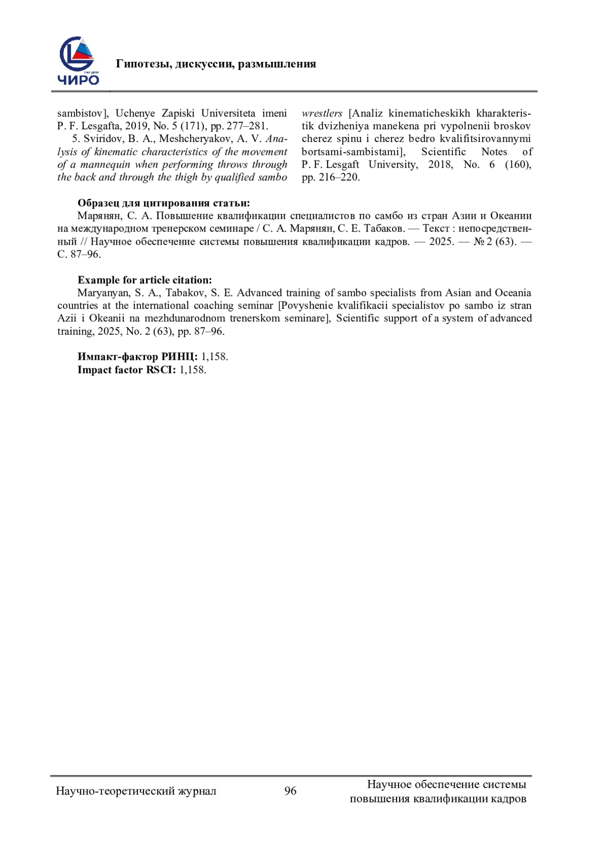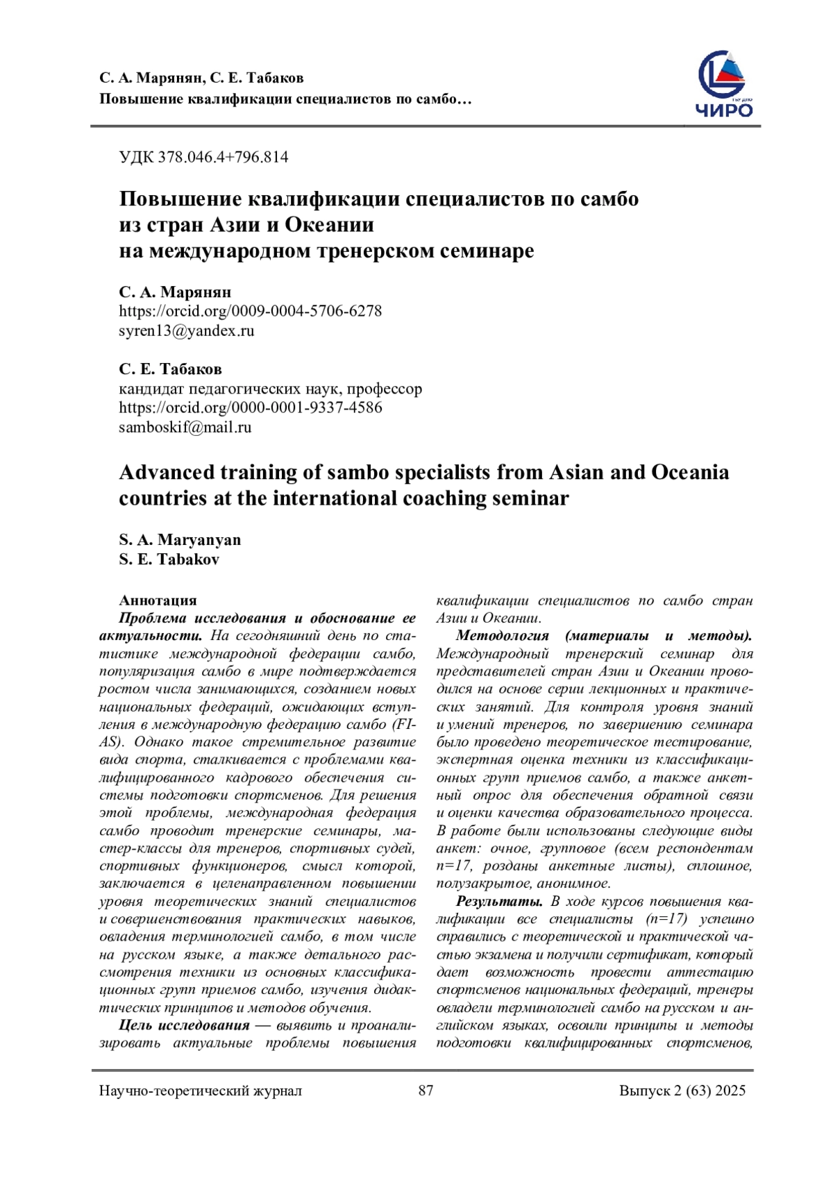 2. Табаков, С. Е. Проблемные разделы курса профессиональной подготовки тренеров по самбо на международных семинарах / С. Е. Табаков, В. С. Табакова, С. А. Марянян. - Текст: непосредственный // Педагогические и биологические проблемы подготовки кадров по спортивным играм и единоборствам: материалы IV межкафедральной конференции, Москва, 23 ноября 2022 года / под общей редакцией С. Е. Табакова. - Москва: Федеральное государственное бюджетное образовательное учреждение высшего образования “Российский университет спорта.,ГЦОЛИФК”, 2022. - С. 59-63. EDN: HJUXEP