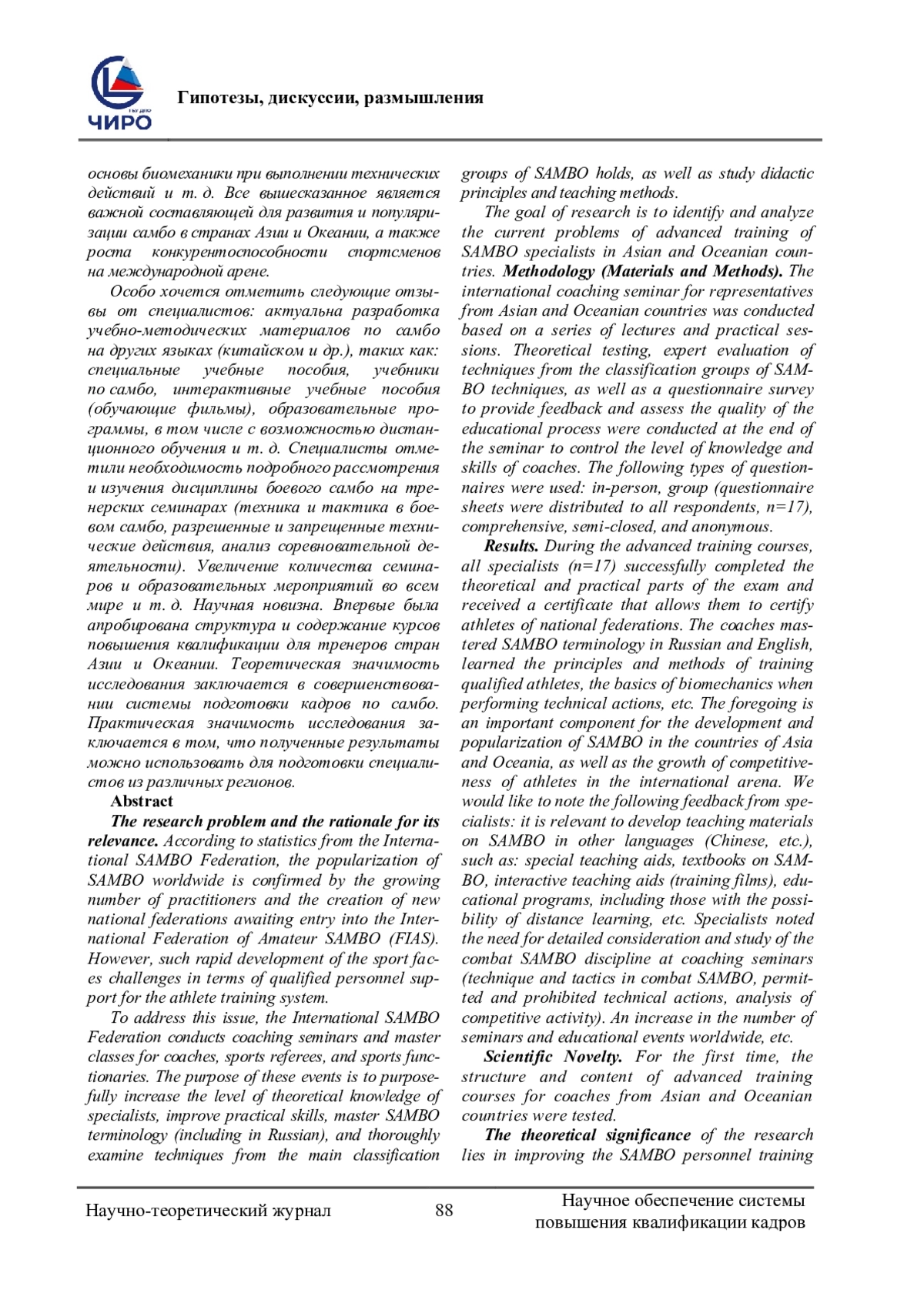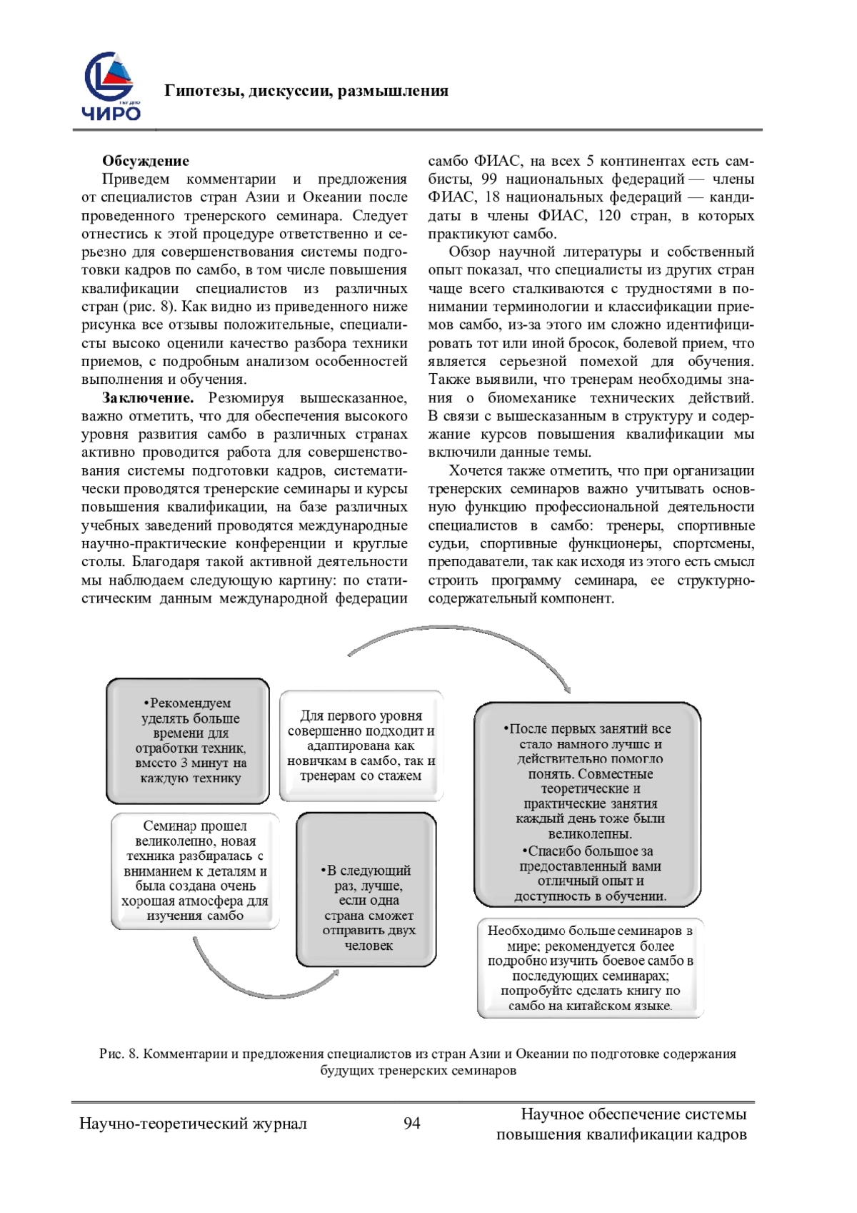Проблема исследования и обоснование ее актуальности. На сегодняшний день по статистике международной федерации самбо, популяризация самбо в мире подтверждается ростом числа занимающихся, созданием новых национальных федераций, ожидающих вступления в международную федерацию самбо (FIAS). Однако такое стремительное развитие вида спорта, сталкивается с проблемами квалифицированного кадрового обеспечения системы подготовки спортсменов. Для решения этой проблемы, международная федерация самбо проводит тренерские семинары, мастер-классы для тренеров, спортивных судей, спортивных функционеров, смысл которой, заключается в целенаправленном повышении уровня теоретических знаний специалистов и совершенствования практических навыков, овладения терминологией самбо, в том числе на русском языке, а также детального рассмотрения техники из основных классификационных групп приемов самбо, изучения дидактических принципов и методов обучения. Цель исследования - выявить и проанализировать актуальные проблемы повышения квалификации специалистов по самбо стран Азии и Океании. Методология (материалы и методы). Международный тренерский семинар для представителей стран Азии и Океании проводился на основе серии лекционных и практических занятий. Для контроля уровня знаний и умений тренеров, по завершению семинара было проведено теоретическое тестирование, экспертная оценка техники из классификационных групп приемов самбо, а также анкетный опрос для обеспечения обратной связи и оценки качества образовательного процесса. В работе были использованы следующие виды анкет: очное, групповое (всем респондентам n=17, розданы анкетные листы), сплошное, полузакрытое, анонимное. Результаты. В ходе курсов повышения квалификации все специалисты (n=17) успешно справились с теоретической и практической частью экзамена и получили сертификат, который дает возможность провести аттестацию спортсменов национальных федераций, тренеры овладели терминологией самбо на русском и английском языках, освоили принципы и методы подготовки квалифицированных спортсменов, основы биомеханики при выполнении технических действий и т. д. Все вышесказанное является важной составляющей для развития и популяризации самбо в странах Азии и Океании, а также роста конкурентоспособности спортсменов на международной арене. Особо хочется отметить следующие отзывы от специалистов: актуальна разработка учебно-методических материалов по самбо на других языках (китайском и др.), таких как: специальные учебные пособия, учебники по самбо, интерактивные учебные пособия (обучающие фильмы), образовательные программы, в том числе с возможностью дистанционного обучения и т. д. Специалисты отметили необходимость подробного рассмотрения и изучения дисциплины боевого самбо на тренерских семинарах (техника и тактика в боевом самбо, разрешенные и запрещенные технические действия, анализ соревновательной деятельности). Увеличение количества семинаров и образовательных мероприятий во всем мире и т. д. Научная новизна. Впервые была апробирована структура и содержание курсов повышения квалификации для тренеров стран Азии и Океании. Теоретическая значимость исследования заключается в совершенствовании системы подготовки кадров по самбо. Практическая значимость исследова
