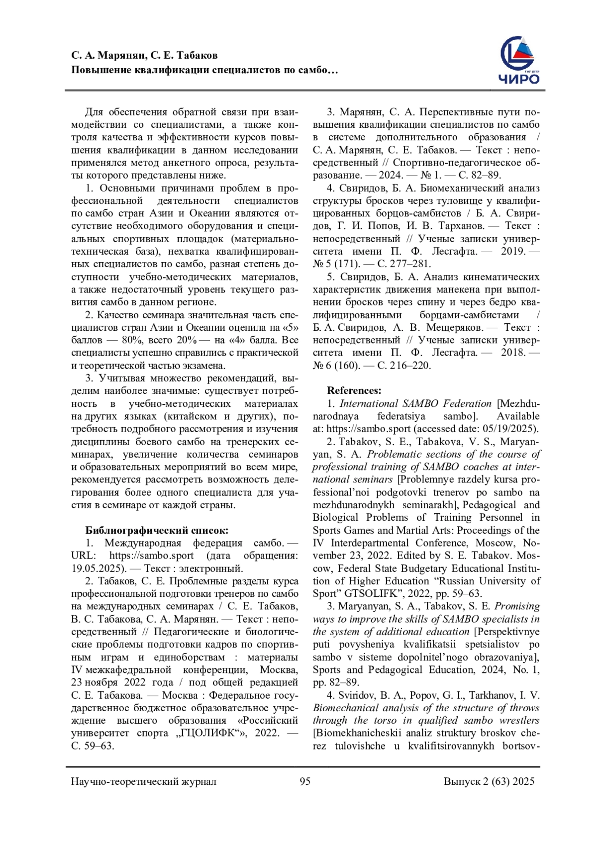 3. Марянян, С. А. Перспективные пути повышения квалификации специалистов по самбо в системе дополнительного образования / С. А. Марянян, С. Е. Табаков. - Текст: непосредственный // Спортивно-педагогическое образование. - 2024. - № 1. - С. 82-89. EDN: WNKFUA