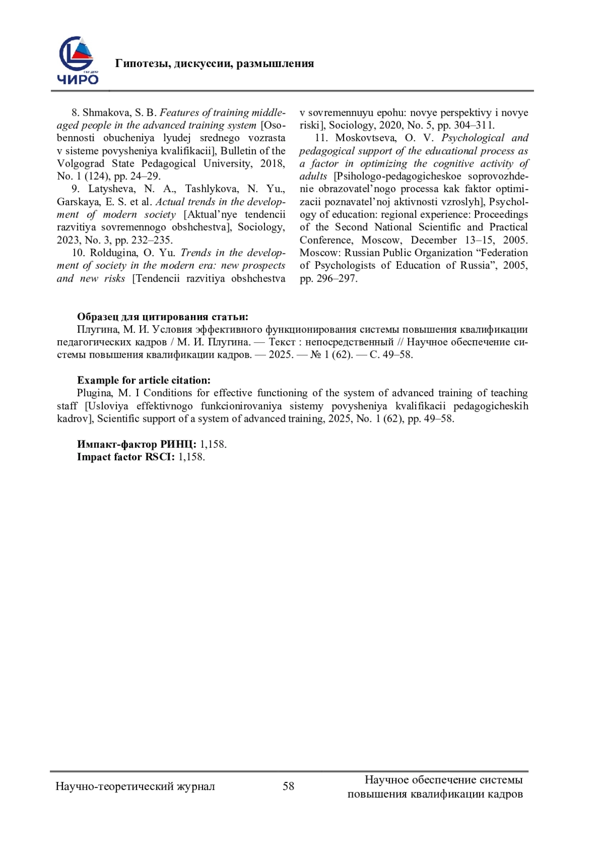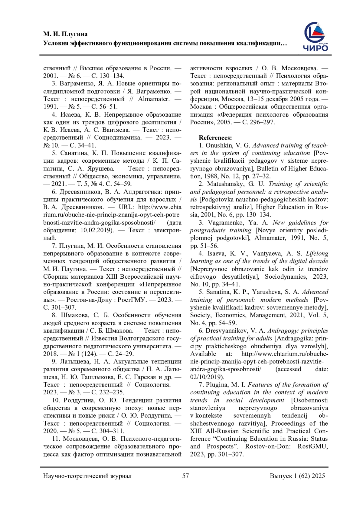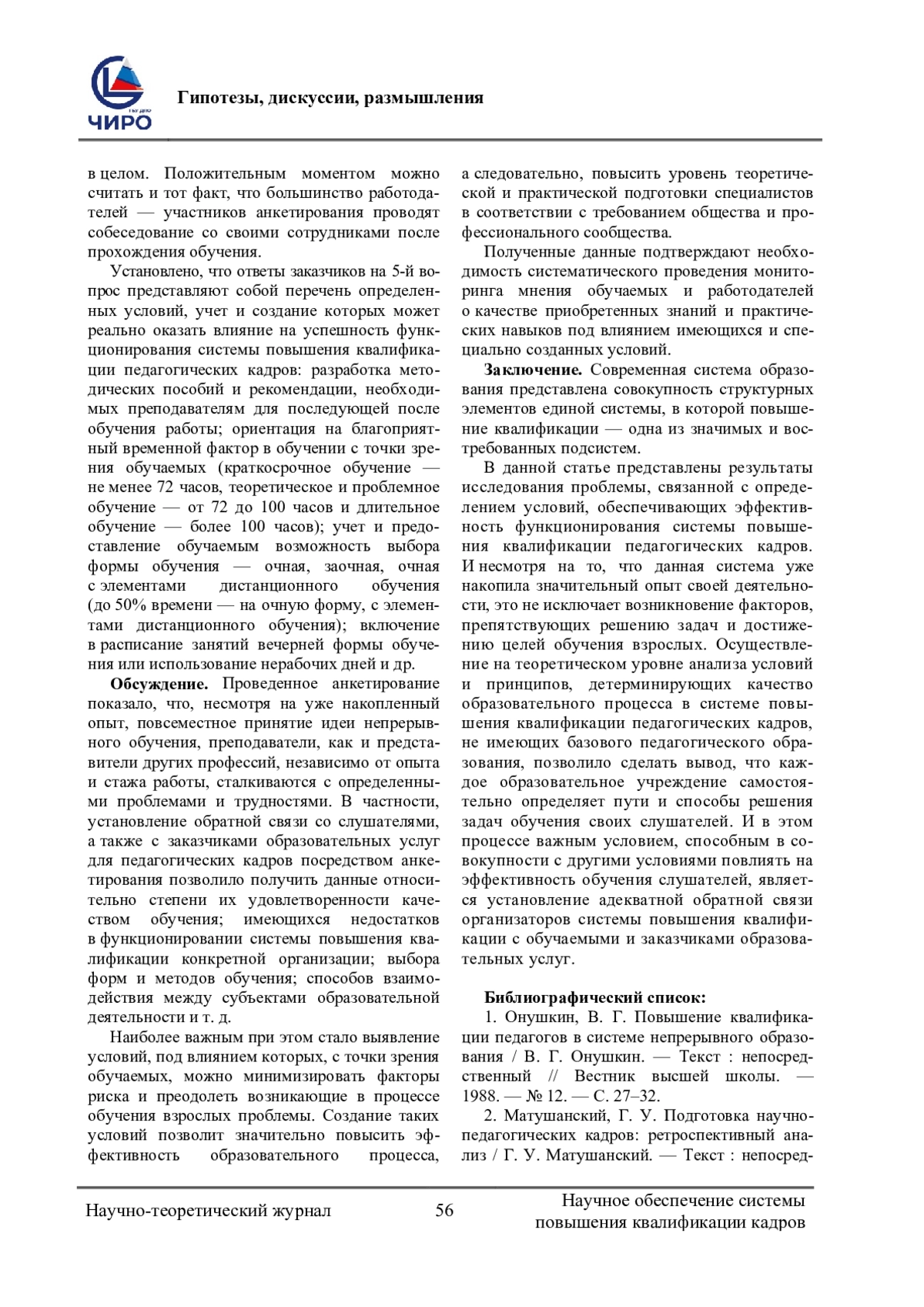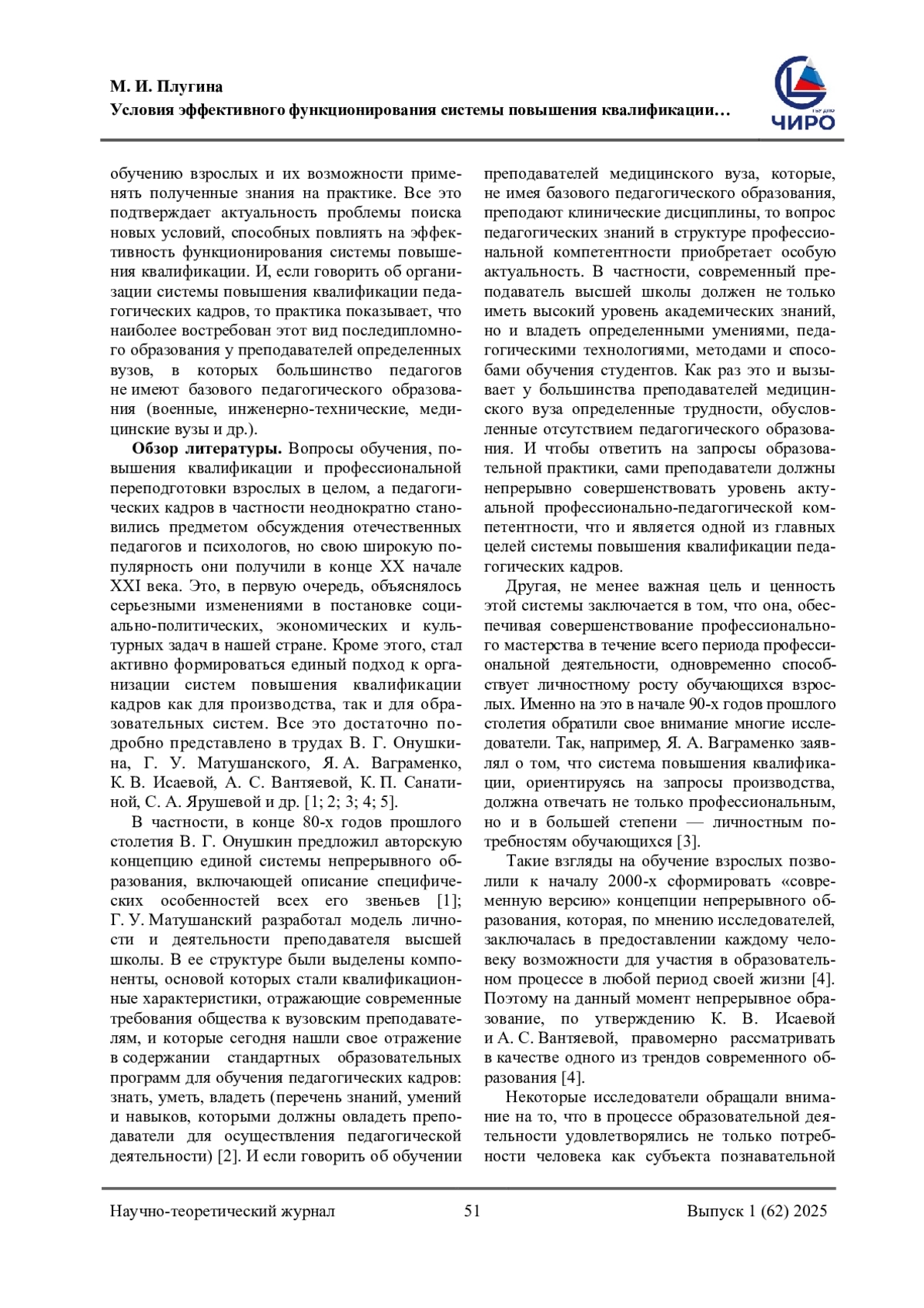 Проблема исследования и обоснование ее актуальности. Решение задач, стоящих перед отечественным образованием, включая систему повышение квалификации педагогических кадров, не может осуществляться вне контекста особенностей общей картины мира, нашего общества и тех тенденций, которые характерны для их развития. Наличие такой тенденции как интеллектуализация общества свидетельствует о росте потребности большинства населения в образовательной деятельности, что требует поиска специальных условий, обеспечивающих эффективность функционирования всех элементов непрерывного образования, призванного обеспечить каждому гражданину возможность непрерывного обучения с целью удовлетворения его потребностей в интеллектуальном, культурно-нравственном и личностно-профессиональном развитии. Наиболее актуальной рассматриваемая проблема является для представителей педагогической профессии, т. к. тот, кто учит других, сам должен постоянно учиться, осваивать новые методы, технологии, средства, способы обучения и воспитания подрастающего поколения. Целью данного исследования является обоснование условий, обеспечивающих эффективность функционирования системы повышения квалификации педагогических кадров медицинского вуза. Методология (материалы и методы). Организация и проведение представленного исследования осуществлялась посредством теоретического анализа научной литературы, анкетирования и бесед с преподавателями медицинского университета - слушателями системы повышения квалификации педагогических кадров. Результаты исследования определяются теоретико-методологическим обоснованием роли система повышения квалификации в совершенствовании профессионализма личности и деятельности преподавателей высшей школы, а также анализом условий, реализация которых может обеспечить эффективность функционирования системы повышения квалификации и качество подготовки педагогических кадров к профессиональной деятельности. Установление обратной связи представителей системы повышения квалификации с потребителями образовательных услуг, рассматриваемой в качестве одного из условий, позволило выявить мнение обучаемых и заказчиков о качестве полученного результата, о факторах, способствующих и препятствующих образовательному процессу.
