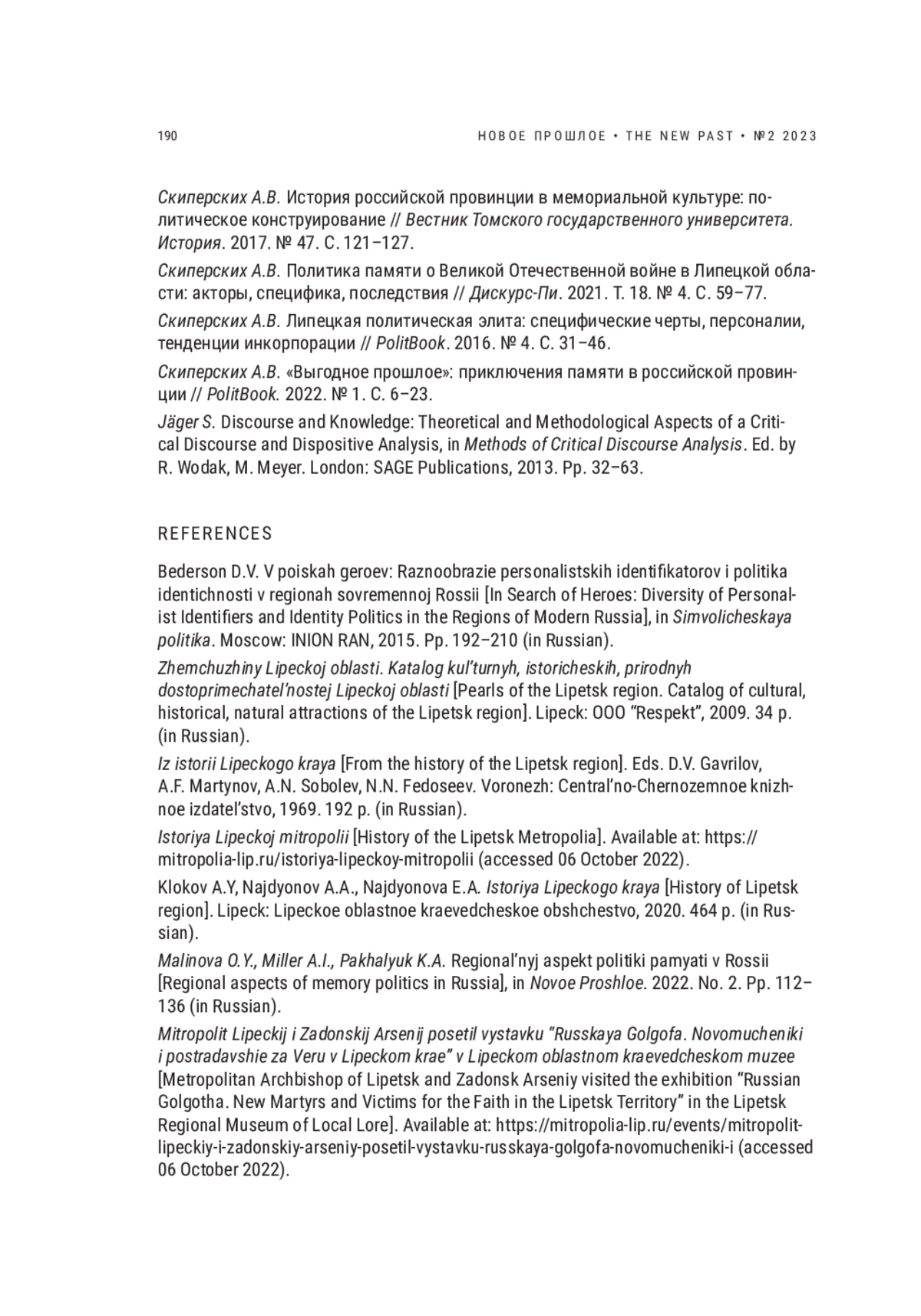 14. Скиперских А.В. “Выгодное прошлое”: приключения памяти в российской провинции // PolitBook. 2022. № 1. С. 6-23. EDN: EHNFGD