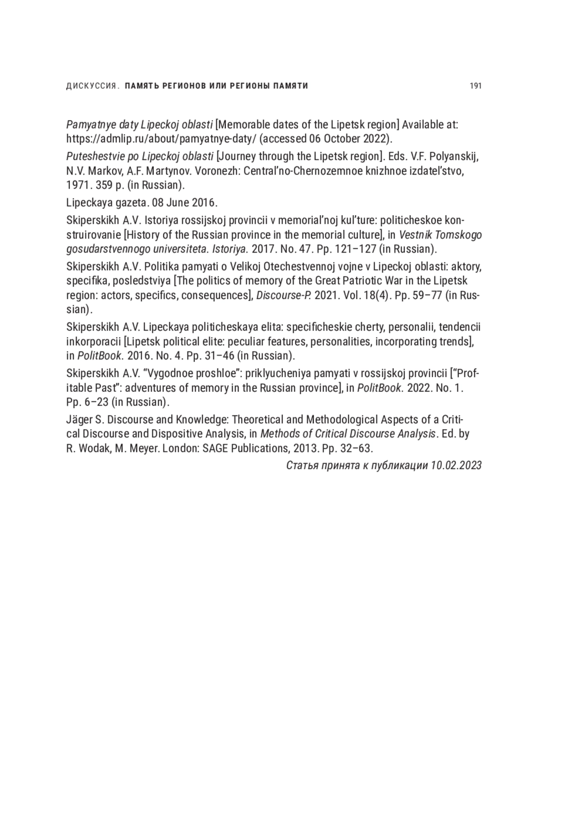 12. Скиперских А.В. Политика памяти о Великой Отечественной войне в Липецкой области: акторы, специфика, последствия // Дискурс-Пи. 2021. Т. 18. № 4. С. 59-77. EDN: TXCQWF
