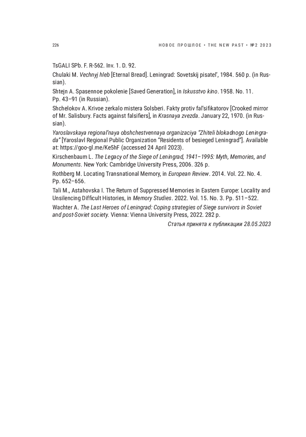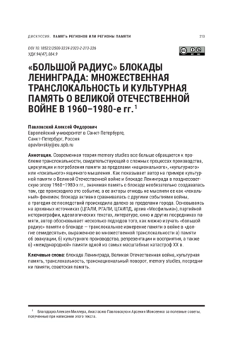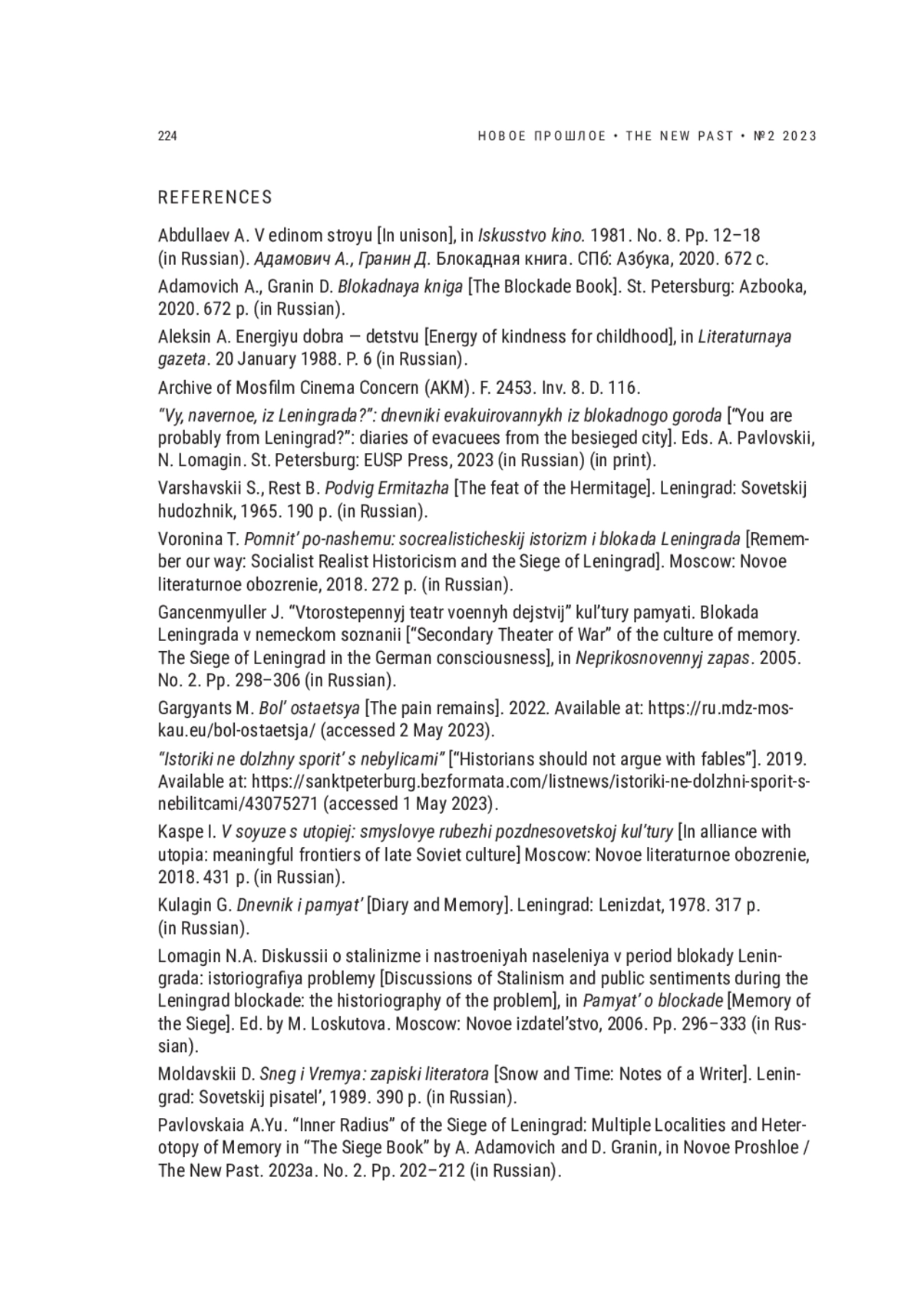 15. Павловская А.Ю. “Малый радиус” блокады Ленинграда: множественные локальности и гетеротопия памяти в “Блокадной книге” А. Адамовича и Д. Гранина // Новое прошлое. 2023. № 2.