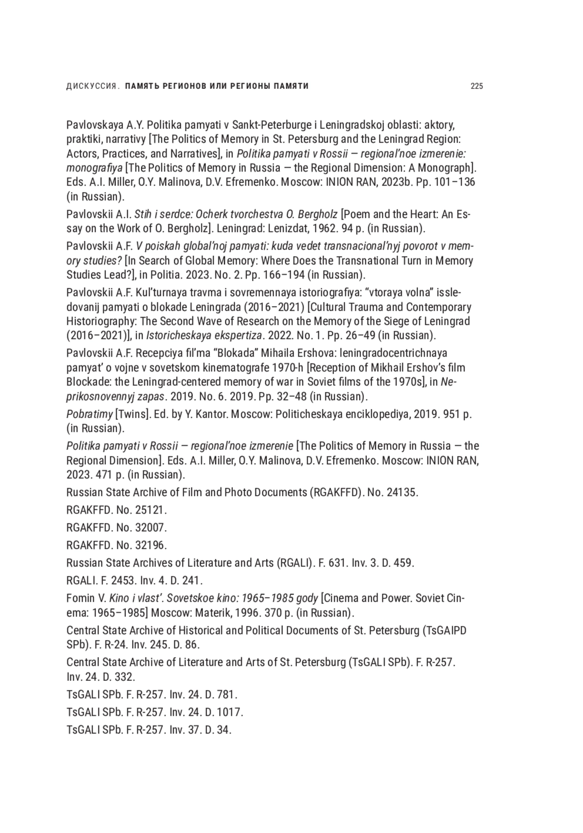 16. Павловская А.Ю. Политика памяти в Санкт-Петербурге и Ленинградской области: акторы, практики, нарративы // Политика памяти в России - региональное измерение. Под ред. А.И. Миллера, О.Ю. Малиновой, Д.В. Ефременко. М.: ИНИОН РАН, 2023. С. 101-136.