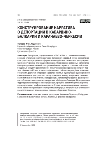 Депортация, осуществленная в 1943 и 1944 гг., занимает ключевую позицию в политике памяти карачаево-балкарского народа. В статье рассматривается существующая разница в формах взаимодействия с памятью о депортации в Карачаево-Черкесии и Кабардино-Балкарии. На основании собранных материалов был проведен качественный текстуальный анализ в рамках стратегии кейс-стади. Введенный концепт «режим памяти» и полученные новые данные с интернет-портала «Кавказский Узел», а также с официальных сайтов глав республик позволяют обнаружить различия в подходах к работе с памятью о депортации в дискурсивном и мемориальном пространствах. Автор приходит к выводу, что разница связана с наличием сильной контгруппы (кабардинцев), которая претендует на доминирование собственного исторического нарратива в Кабардино-Балкарии. Неразрешенные территориальные споры и незавершенность процесса реабилитации балкарского народа усиливают конфронтацию памяти. В тоже время формирование карачаевского нарратива происходит в компромиссной среде, а интерпретация этнического прошлого занимает доминирующие позиции в Карачаево-Черкесии