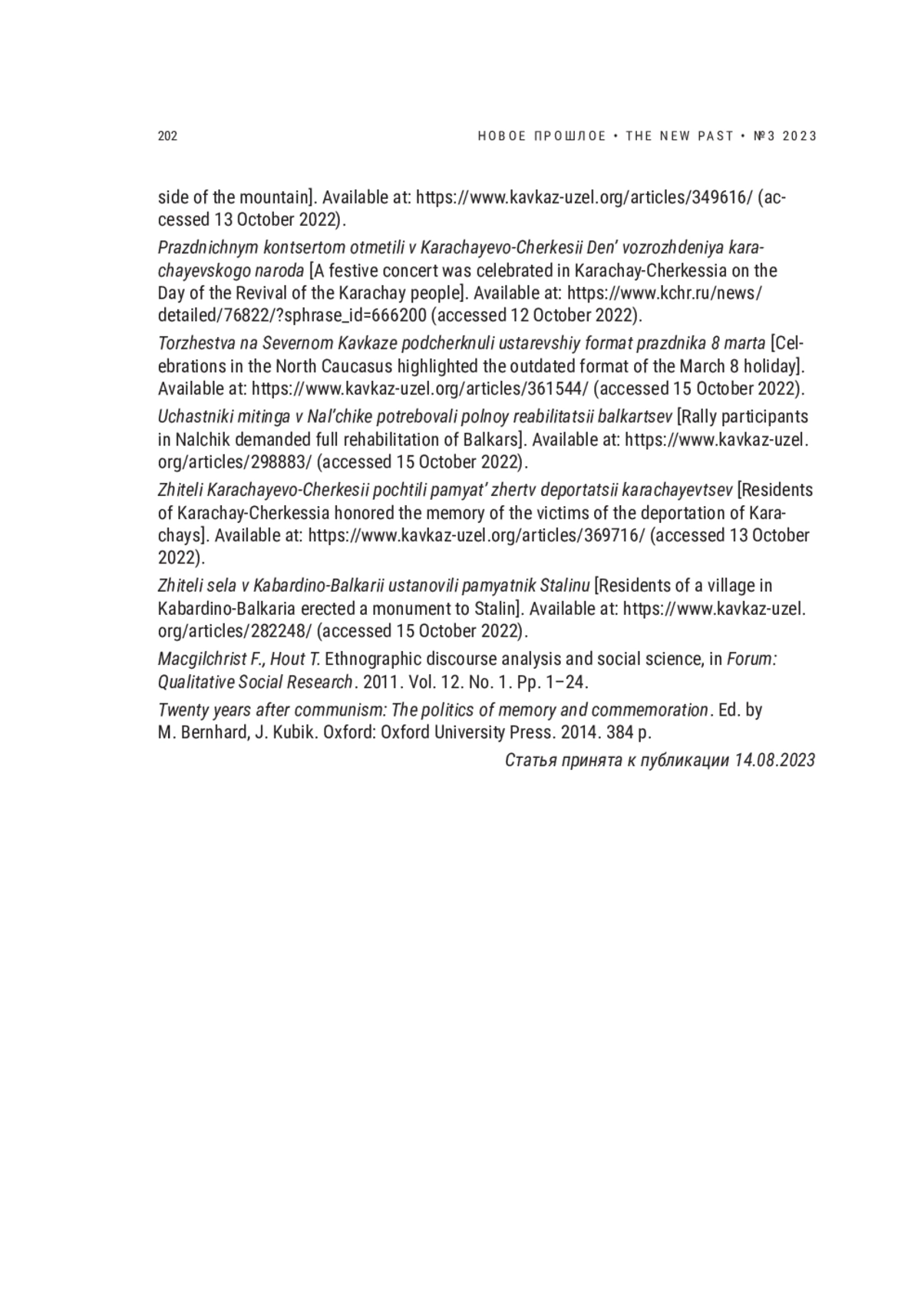 9. Жители Карачаево-Черкесии почтили память жертв депортации карачаевцев. URL: https://www.kavkaz-uzel.org/articles/369716/ (дата обращения - 13 октября 2022 г.).