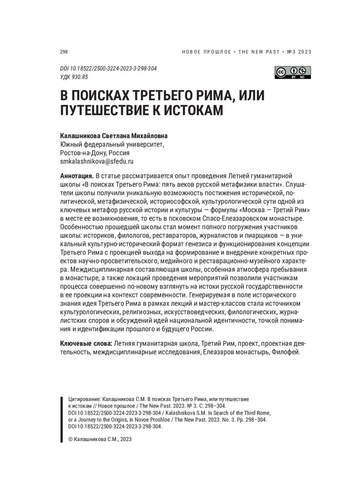 КАЛАШНИКОВА С. М. В ПОИСКАХ ТРЕТЬЕГО РИМА, ИЛИ ПУТЕШЕСТВИЕ К ИСТОКАМ // НОВОЕ ПРОШЛОЕ. 2023. № 3