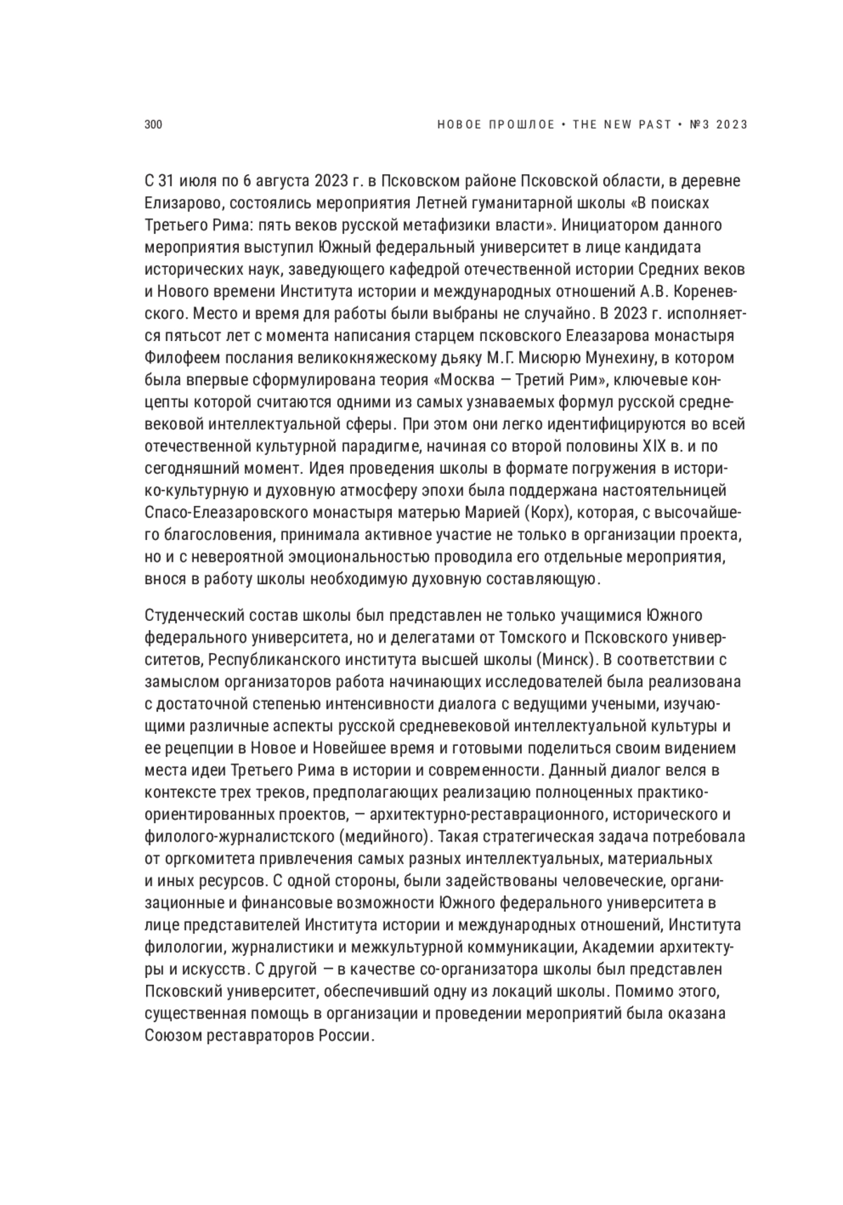 В статье рассматривается опыт проведения Летней гуманитарной школы «В поисках Третьего Рима: пять веков русской метафизики власти». Слушатели школы получили уникальную возможность постижения исторической, политической, метафизической, историософской, культурологической сути одной из ключевых метафор русской истории и культуры — формулы «Москва — Третий Рим» в месте ее возникновения, то есть в псковском Спасо-Елеазаровском монастыре. Особенностью прошедшей школы стал момент полного погружения участников школы: историков, филологов, реставраторов, журналистов и пиарщиков — в уникальный культурно-исторический формат генезиса и функционирования концепции Третьего Рима с проекцией выхода на формирование и внедрение конкретных проектов научно-просветительского, медийного и реставрационно-музейного характера. Междисциплинарная составляющая школы, особенная атмосфера пребывания в монастыре, а также локаций проведения мероприятий позволили участникам процесса совершенно по-новому взглянуть на истоки русской государственности в ее проекции на контекст современности. Генерируемая в поле исторического знания идея Третьего Рима в рамках лекций и мастер-классов стала источником культурологических, религиозных, искусствоведческих, филологических, журналистских споров и обсуждений идей национальной идентичности, точкой понимания и идентификации прошлого и будущего России.
