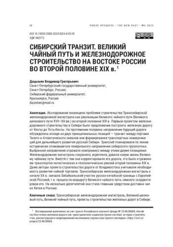 Исследование посвящено проблеме строительства Транссибирской железнодорожной магистрали как реализации Великого чайного пути (Великого шелкового пути XVII–ХХ вв.) во второй половине XIX в. Первым проектом железнодорожного строительства в Сибири было предложение построить железную дорогу от Кяхты до Усть-Кяхты. На протяжении полувека направление будущей дороги обсуждолась исходя из двух принципиальных позиций — транзит между портами Тихого и Атлантического океанов или формирование транспортных коммуникаций для дальнейшего развития русской Сибири. Транссиб планировали по линии исторически сложившегося генерального направления сибирского грузопотока. Выбранное направление отражало компромисс между этими двумя позициями. Железнодорожная магистраль сохраняла, укрепляла, давала новую жизнь Великому чайному пути. Вместе с тем она корректировала его дороги, что было отражением транспортно-логистических и геополитических реалий второй половины XIX в. Даже авторы проекта строительства дороги от Владивостока учитывали необходимость развития чайной торговли. Транcсибирская железнодорожная магистраль к началу ХХ в. связала Забайкальский участок русско-китайской границы с Европейской Россией, т. е. прошла по маршруту Великого чайного пути, немного скорректировав его. На несколько десятилетий она стала главным средством доставки чая из Китая в Россию