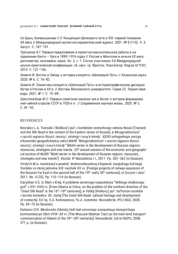 1. Безруков Л.А. Транссиб и Шелковый путь в контексте восточного вектора России // Многовекторность в развитии регионов России: ресурсы, стратегии и новые тренды. XXXIII ежегодная сессия экономико-географической секции МАРС “Многовекторность в развитии регионов России: ресурсы, стратегии и новые тренды”. Иркутск: ИП Матушкина И.И., 2017. С. 252-262. EDN: ZFWISL