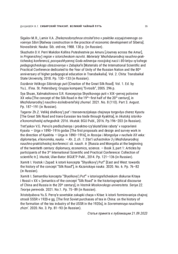 3. Дацышен В.Г. Из Сибири в Китай: к проблеме северного направления “Великого шелкового пути” в XVI-XVIII вв. // Великий Шелковый путь: культурное наследие и развитие контактов. Под ред. С.А. Комиссарова, Ю.А. Азаренко. Новосибирск: ИПЦ НГУ, 2020. С. 69-75.