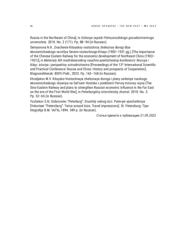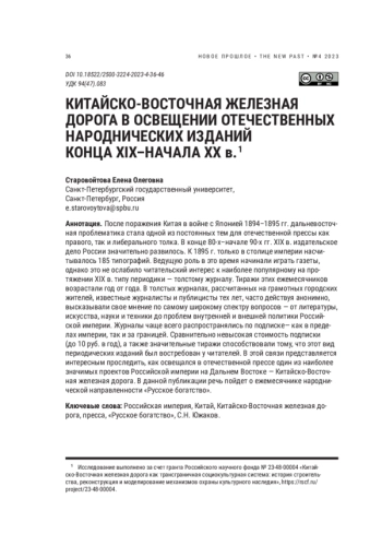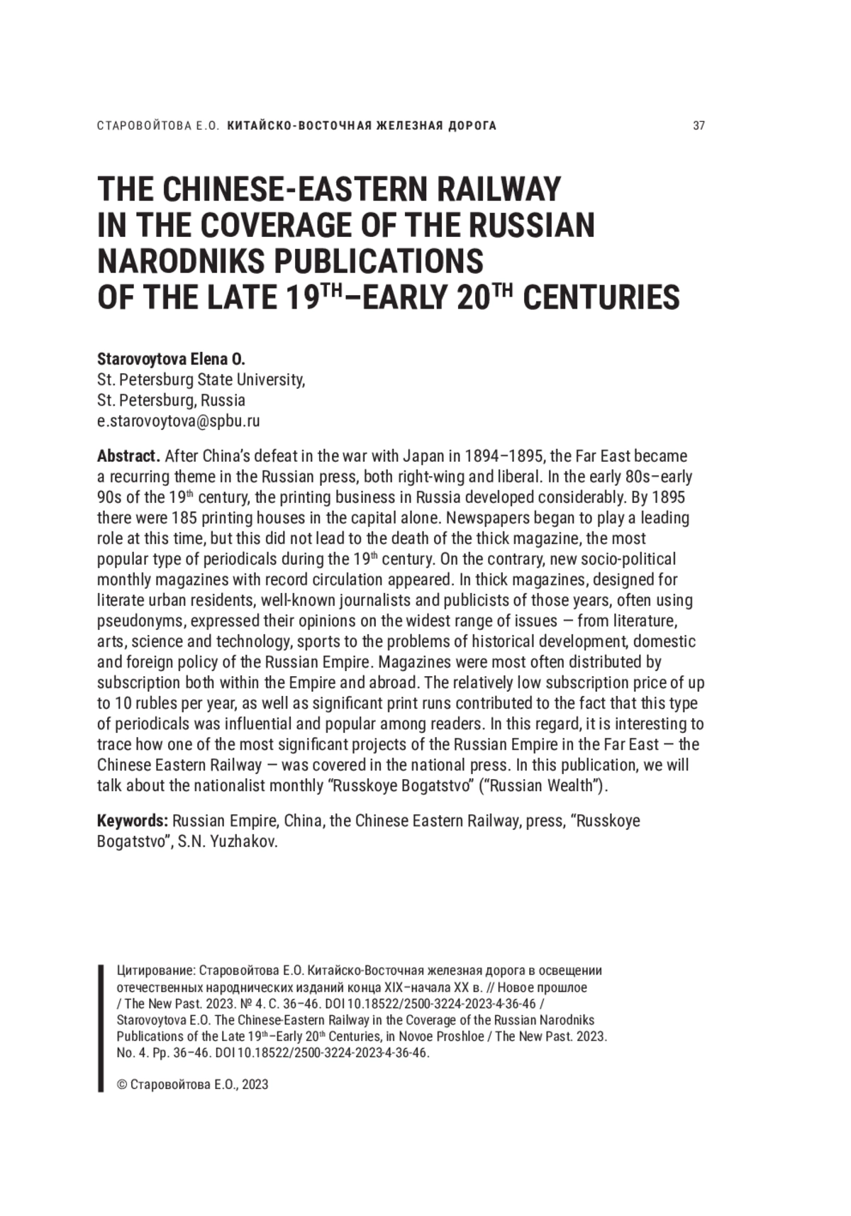 СТАРОВОЙТОВА Е. О. КИТАЙСКО-ВОСТОЧНАЯ ЖЕЛЕЗНАЯ ДОРОГА В ОСВЕЩЕНИИ ОТЕЧЕСТВЕННЫХ НАРОДНИЧЕСКИХ ИЗДАНИЙ КОНЦА XIX-НАЧАЛА XX В // НОВОЕ ПРОШЛОЕ. 2023. № 4