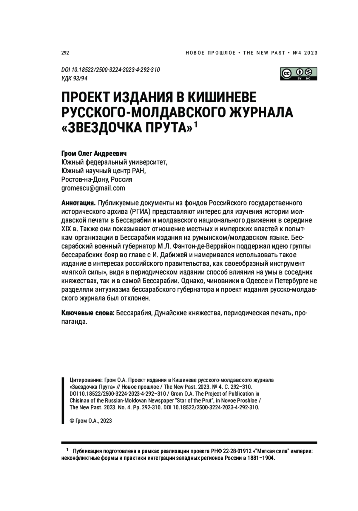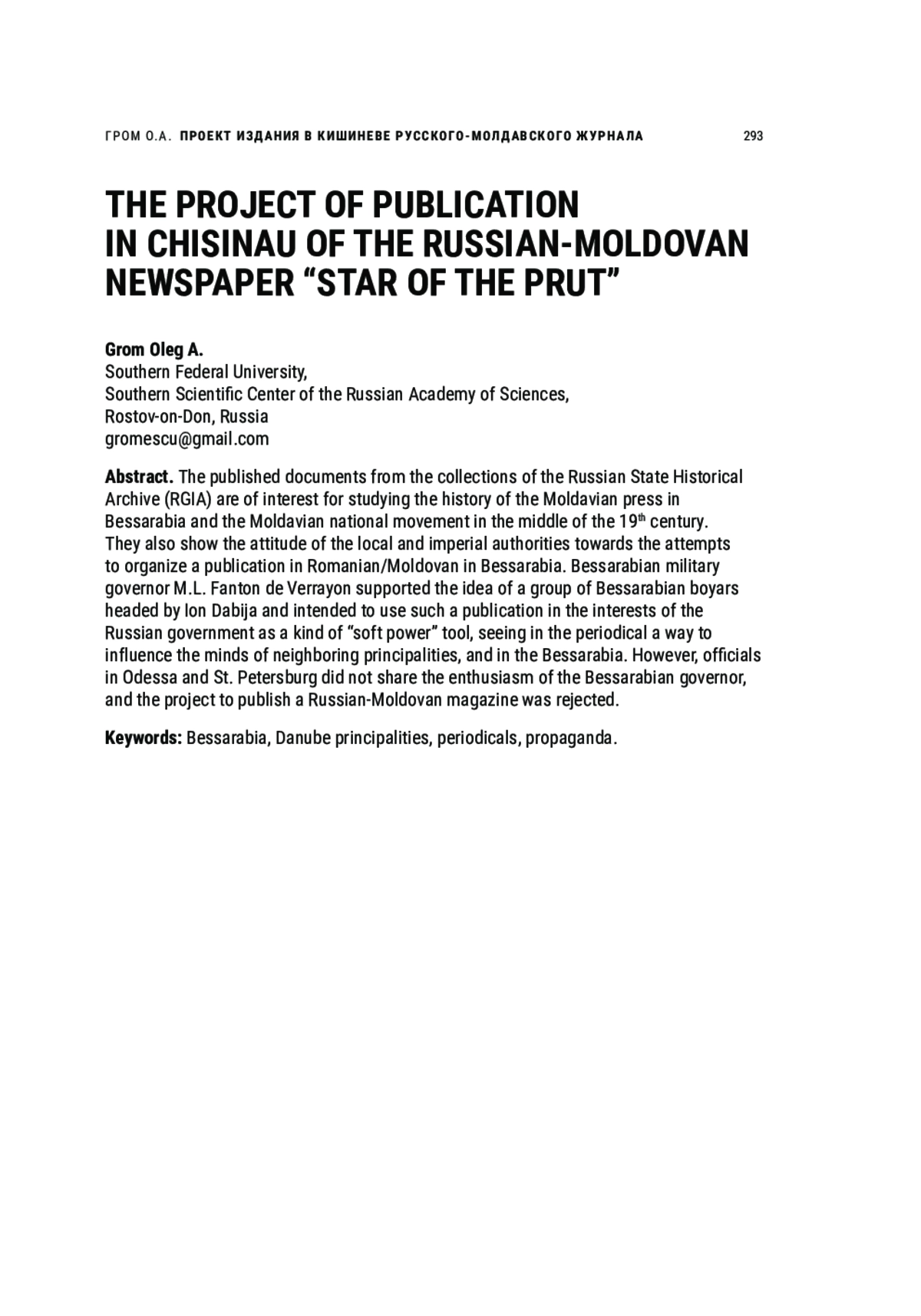 Публикуемые документы из фондов Российского государственного исторического архива (РГИА) представляют интерес для изучения истории молдавской печати в Бессарабии и молдавского национального движения в середине XIX в. Также они показывают отношение местных и имперских властей к попыткам организации в Бессарабии издания на румынском/молдавском языке. Бессарабский военный губернатор М. Л. Фантон-де-Веррайон поддержал идею группы бессарабских бояр во главе с И. Дабижей и намеривался использовать такое издание в интересах российского правительства, как своеобразный инструмент «мягкой силы», видя в периодическом издании способ влияния на умы в соседних княжествах, так и в самой Бессарабии. Однако, чиновники в Одессе и Петербурге не разделяли энтузиазма бессарабского губернатора и проект издания русско-молдавского журнала был отклонен