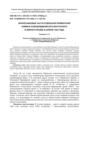 Раскрыты количественный и качественный состав бронетанковых частей Отдельной Приморской армии накануне и в период проведения первого этапа Крымской наступательной операции в апреле 1944 года, описаны основные боевые действия этих частей. Особо подробно отражены события освобождения населенных пунктов Юго-Восточного Крыма, ранее никак не отмеченные в историографии войны; выявлены проблемы и поставлены задачи для дальнейших исследований действий советских войск на Южном берегу Крыма. Впервые в историографии даны подробные сведения о советских танкистах, погибших в ходе боёв и местах их первичного захоронения. С использованием архивных документов, повествовательных источников в исследовании реконструирован и приведен ряд ранее неизвестных моментов истории освобождения Крыма, уточнены некоторые обстоятельства известных событий.