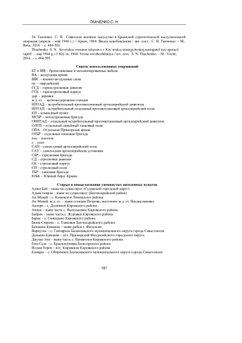 54. Ткаченко С. Н. Советское военное искусство в Крымской стратегической наступательной операции (апрель - май 1944 г.) // Крым, 1944: Весна освобождения / авт.-сост. С. Н. Ткаченко. - М.: Вече, 2014. - С. 484-501.