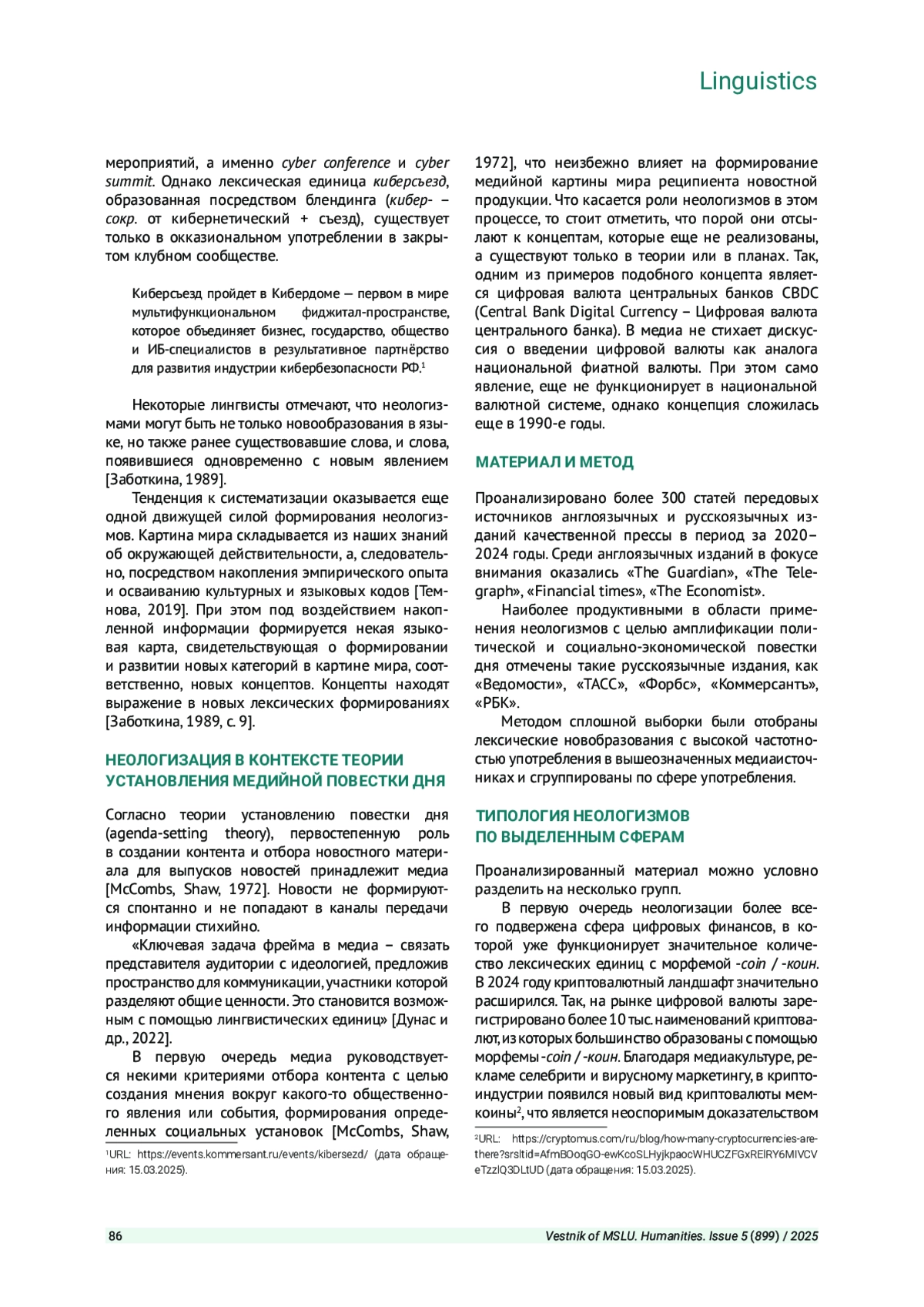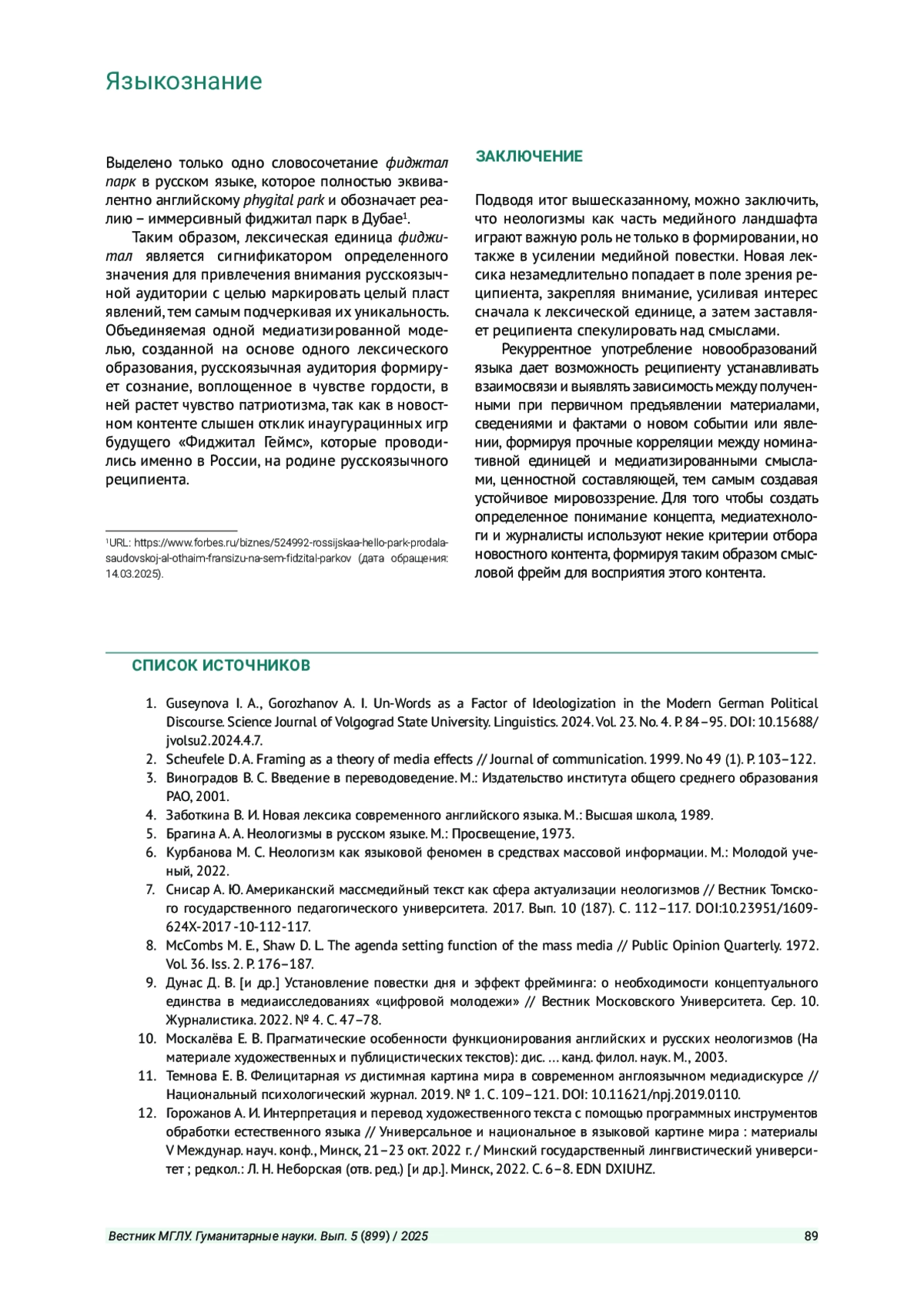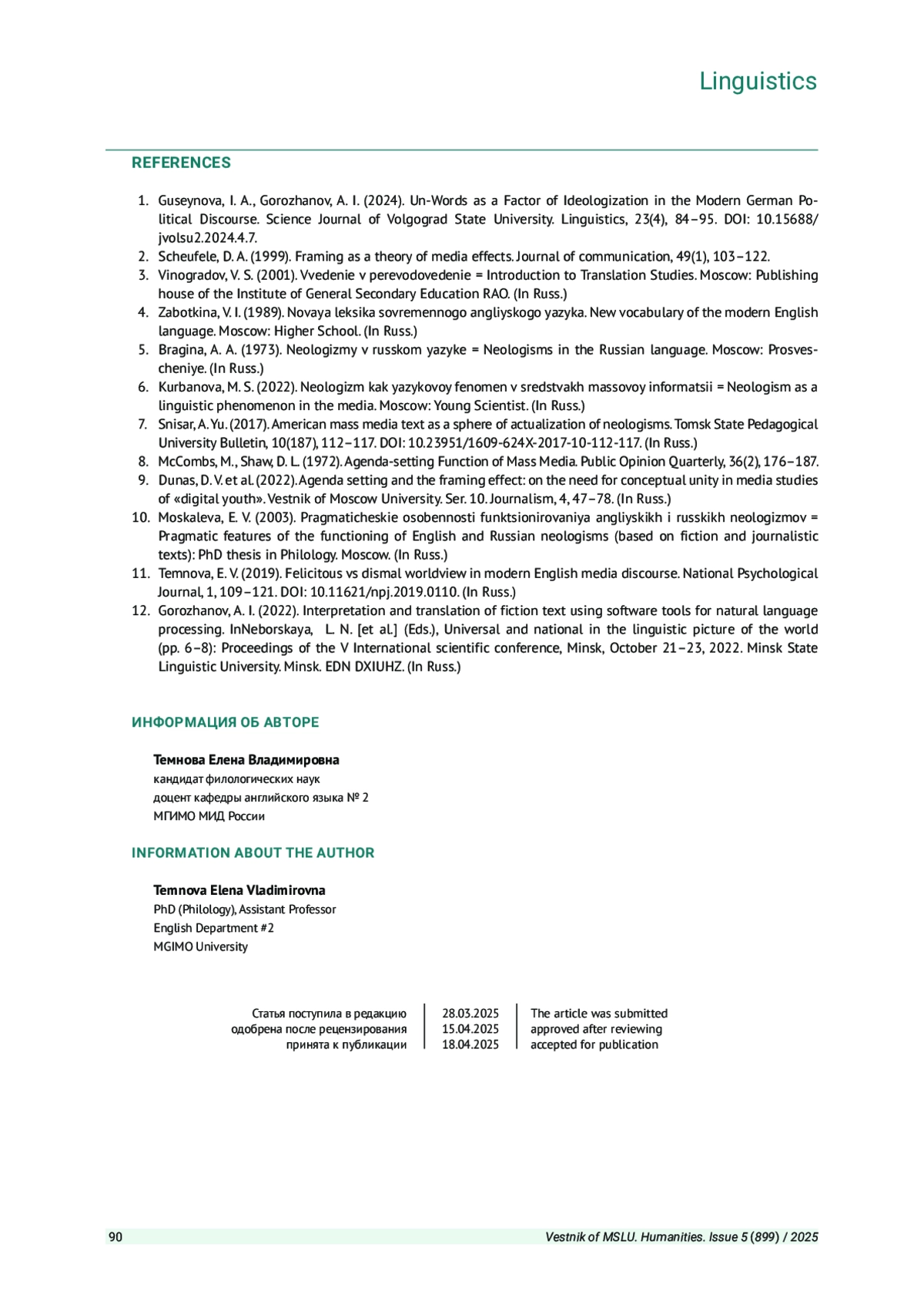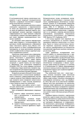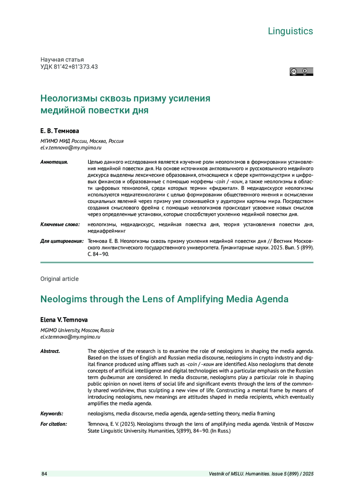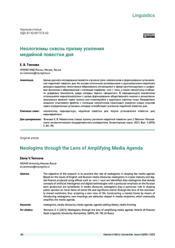 ТЕМНОВА Е. В. НЕОЛОГИЗМЫ СКВОЗЬ ПРИЗМУ УСИЛЕНИЯ МЕДИЙНОЙ ПОВЕСТКИ ДНЯ // ВЕСТНИК МОСКОВСКОГО ГОСУДАРСТВЕННОГО ЛИНГВИСТИЧЕСКОГО УНИВЕРСИТЕТА. ГУМАНИТАРНЫЕ НАУКИ. 2025. № 5 (899)