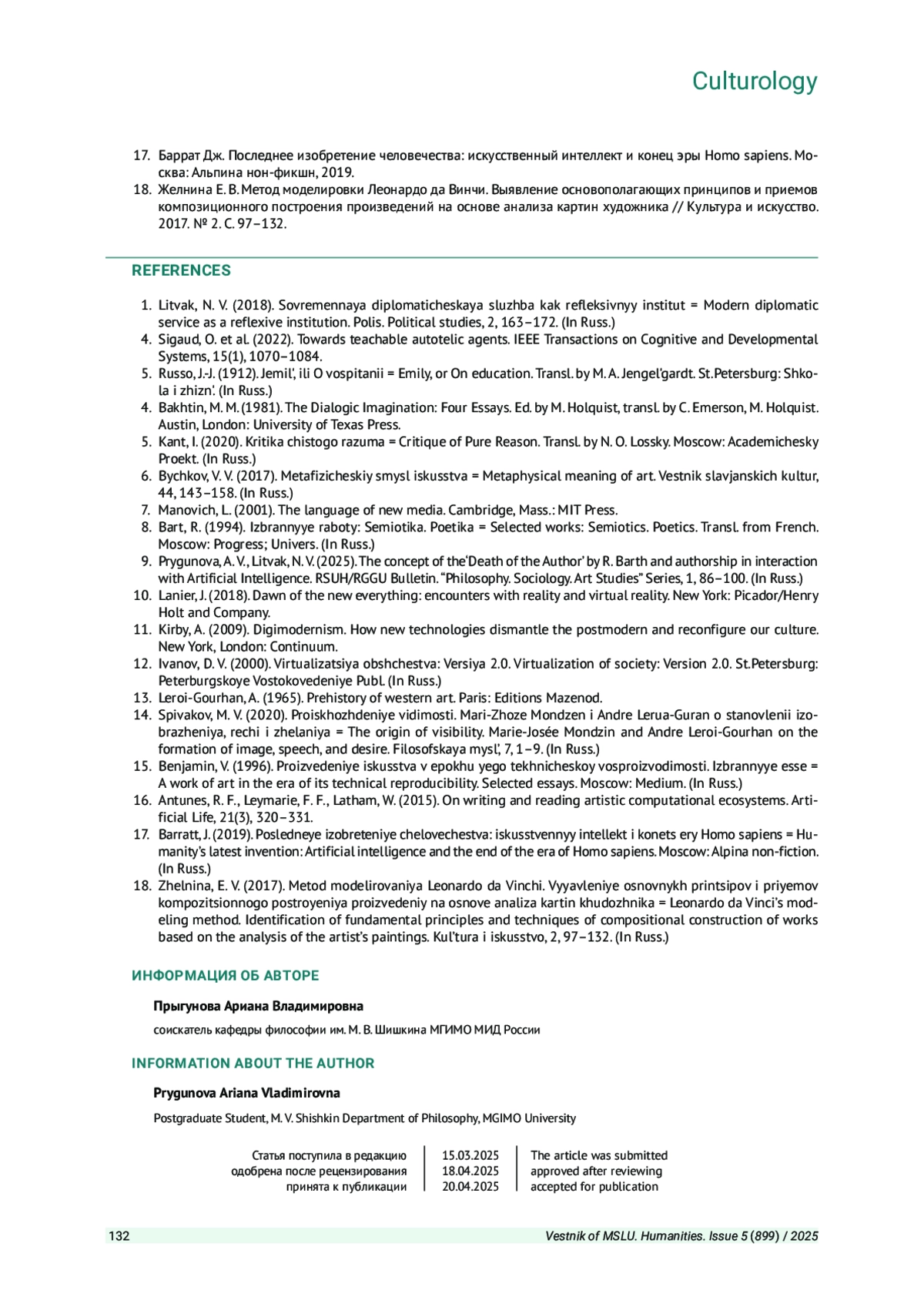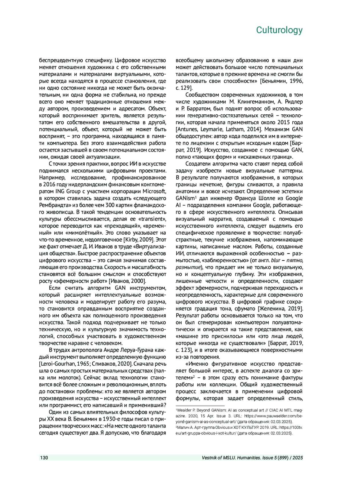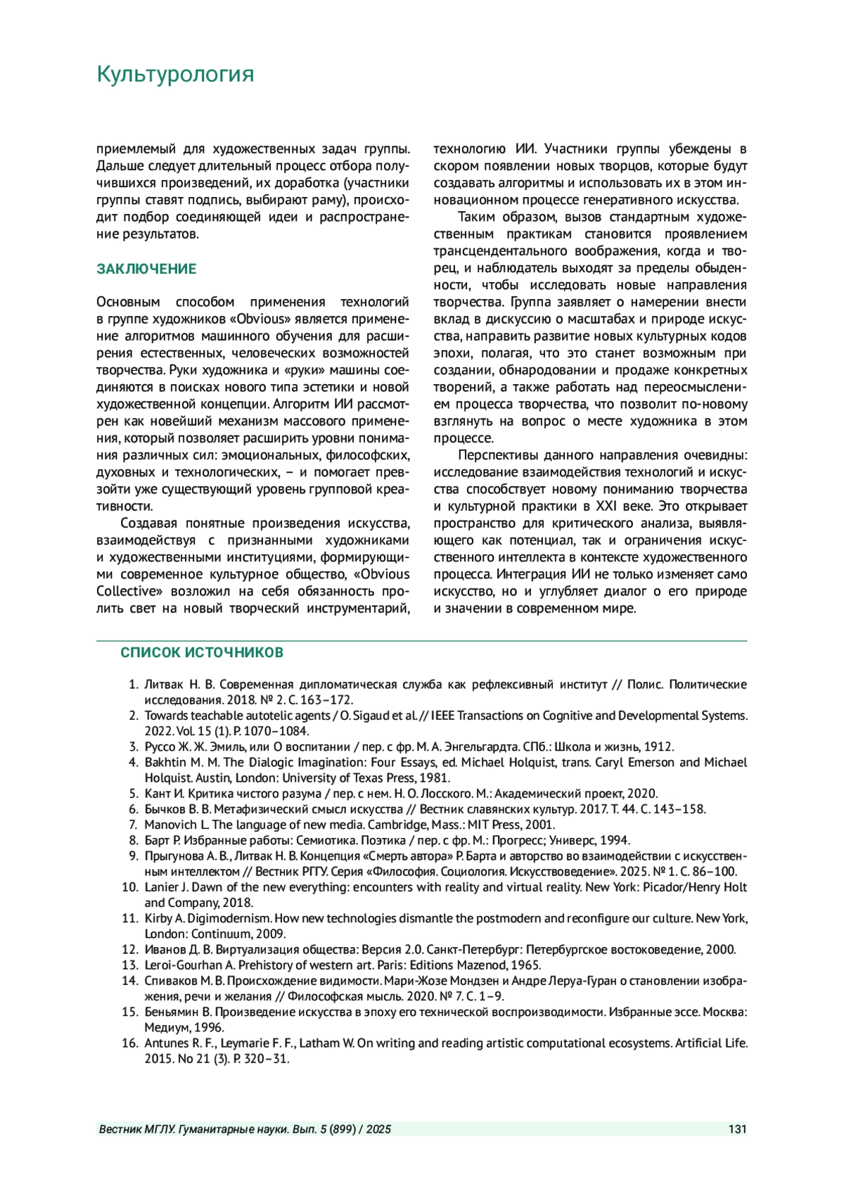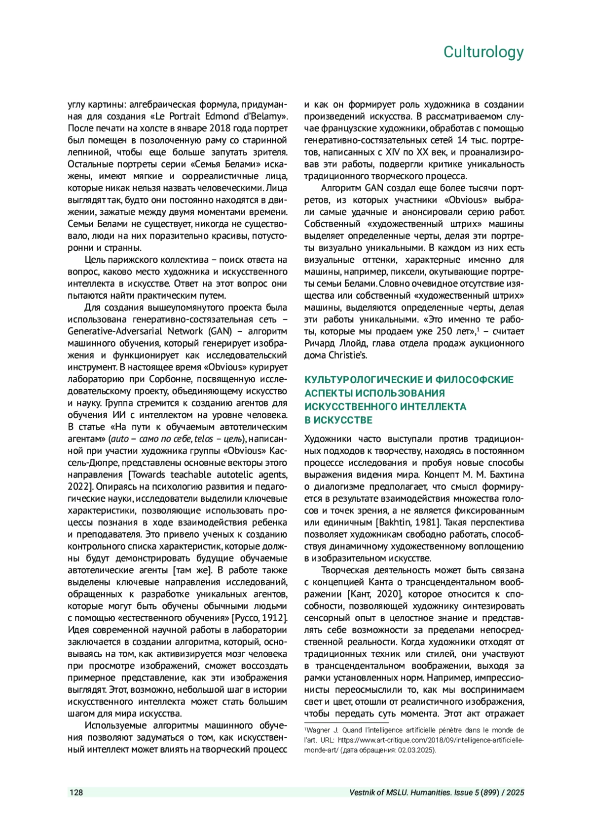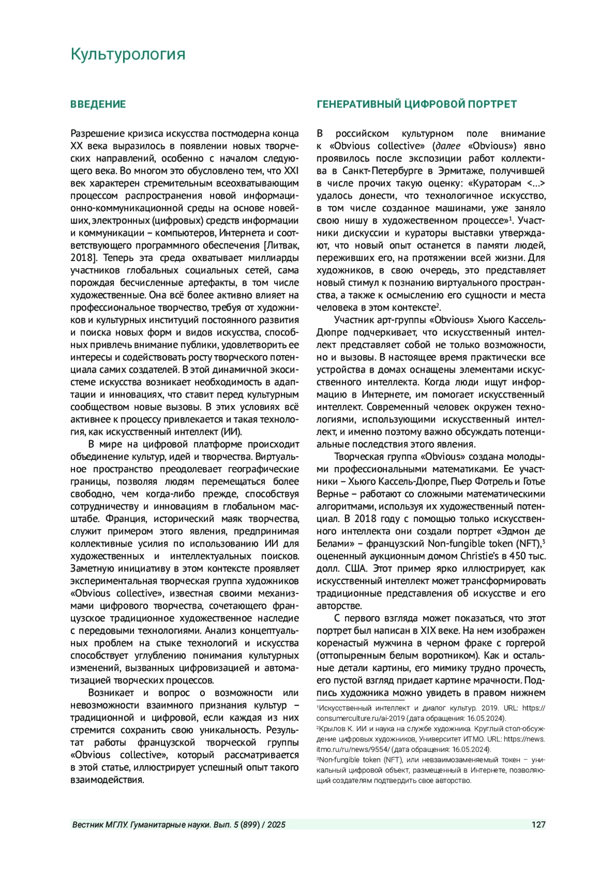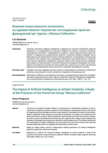 ПРЫГУНОВА А. В. ВЛИЯНИЕ ИСКУССТВЕННОГО ИНТЕЛЛЕКТА НА ХУДОЖЕСТВЕННОЕ ТВОРЧЕСТВО: ИССЛЕДОВАНИЕ ПРАКТИК ФРАНЦУЗСКОЙ АРТ-ГРУППЫ «OBVIOUS COLLECTIVE» // ВЕСТНИК МОСКОВСКОГО ГОСУДАРСТВЕННОГО ЛИНГВИСТИЧЕСКОГО УНИВЕРСИТЕТА. ГУМАНИТАРНЫЕ НАУКИ. 2025. № 5 (899)