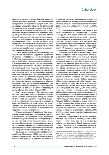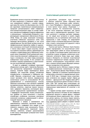Ключевые фразы: цифровое искусство, цифровая культура, культура в международных отношениях, генеративное искусство, искусственный интеллект, АЛГОРИТМЫ, ГЕНЕРАТИВНО-СОСТЯЗАТЕЛЬНЫЕ СЕТИ