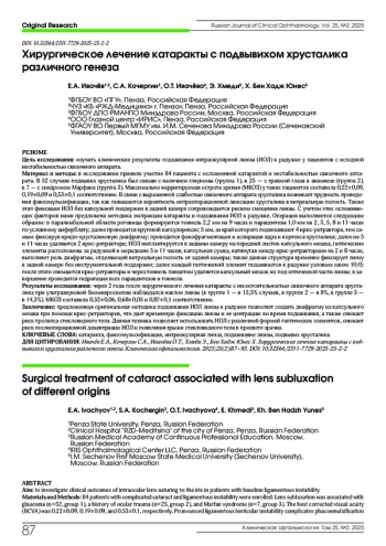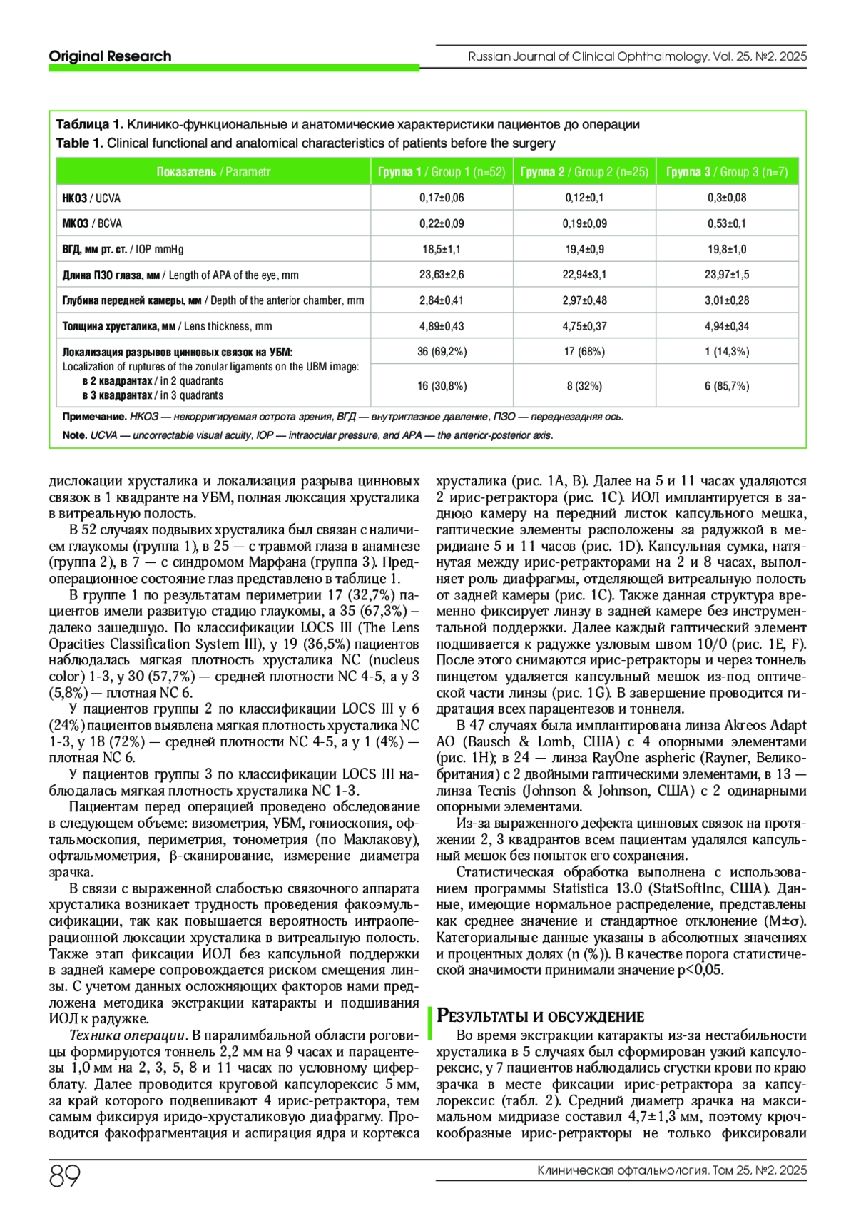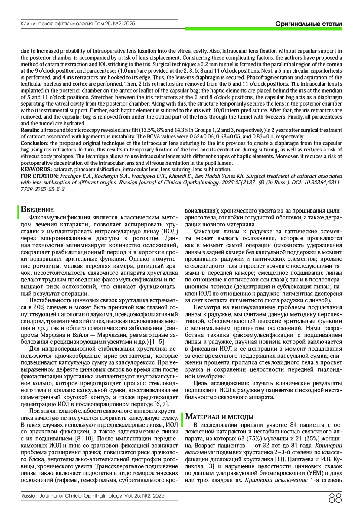 Материал и методы: в исследовании приняли участие 84 пациента с осложненной катарактой и нестабильностью связочного аппарата. В 52 случаях подвывих хрусталика был связан с наличием глаукомы (группа 1), в 25 — с травмой глаза в анамнезе (группа 2), в 7 — с синдромом Марфана (группа 3). Максимально корригируемая острота зрения (МКОЗ) у таких пациентов составила 0,22±0,09, 0,19±0,09 и 0,53±0,1 соответственно. В связи с выраженной слабостью связочного аппарата хрусталика возникает трудность проведения факоэмульсификации, так как повышается вероятность интраоперационной люксации хрусталика в витреальную полость. Также этап фиксации ИОЛ без капсульной поддержки в задней камере сопровождается риском смещения линзы. С учетом этих осложняющих факторов нами предложена методика экстракции катаракты и подшивания ИОЛ к радужке. Операция выполняется следующим образом: в паралимбальной области роговицы формируются тоннель 2,2 мм на 9 часах и парацентезы 1,0 мм на 2, 3, 5, 8 и 11 часах по условному циферблату; далее проводится круговой капсулорексис 5 мм, за край которого подвешивают 4 ирис-ретрактора, тем самым фиксируя иридо-хрусталиковую диафрагму; проводится факофрагментация и аспирация ядра и кортекса хрусталика; далее на 5 и 11 часах удаляются 2 ирис-ретрактора; ИОЛ имплантируется в заднюю камеру на передний листок капсульного мешка, гаптические элементы расположены за радужкой в меридиане 5 и 11 часов; капсульная сумка, натянутая между ирис-ретракторами на 2 и 8 часах, выполняет роль диафрагмы, отделяющей витреальную полость от задней камеры; также данная структура временно фиксирует линзу в задней камере без инструментальной поддержки; далее каждый гаптический элемент подшивается к радужке узловым швом 10/0; после этого снимаются ирис-ретракторы и через тоннель пинцетом удаляется капсульный мешок из-под оптической части линзы; в завершение проводится гидратация всех парацентезов и тоннеля.