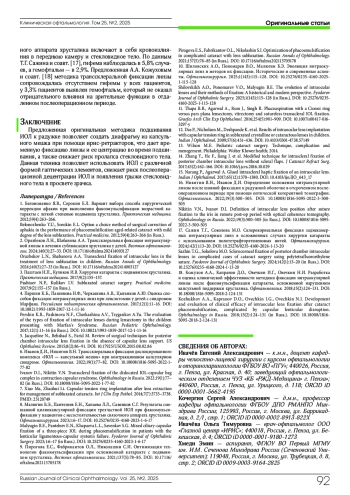 5. Jacqueline N., Behshad S., Farid M. Review of surgical techniques for posterior chamber intraocular lens fixation in the absence of capsular lens support. US Ophthalmic Review. 2015;8(2):86-91. DOI: 10.17925/USOR.2015.08.02.86