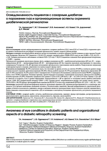 Заключение: результаты продемонстрировали важность проведения скрининга ДР, учитывая распространенность и социальную значимость СД и процент выявленных изменений сетчатки у бессимптомных пациентов. Высокая информативность двухпольной фотографии сетчатки и возможность сравнивать снимки в динамике являются преимуществами такого подхода в качестве скринингового. Важно повышать осведомленность пациентов о ДР, их мотивацию к ежегодному посещению офтальмолога, доступность медицинской помощи.