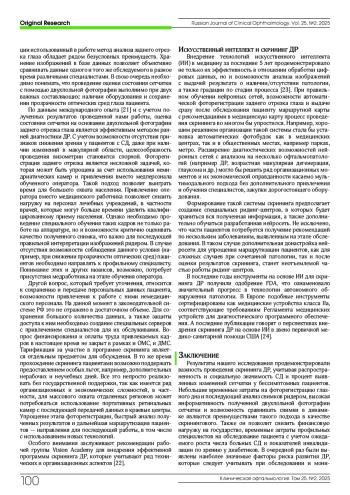 13. Kummerle D., Beals D., Simon L. et al. Revolutionizing Diabetic Retinopathy Screening: Integrating AI-Based Retina l Imaging in Primary Care. J CME. 2025;14(1):2437294. 10.1080/28338073.2024.2437294. Erratum in: J CME. 2025;14(1):2454117. 10.1080/28338073.2025.2454117. DOI: 10.1080/28338073.2024.2437294.Erratumin