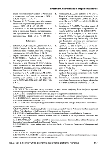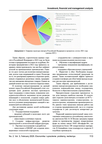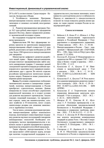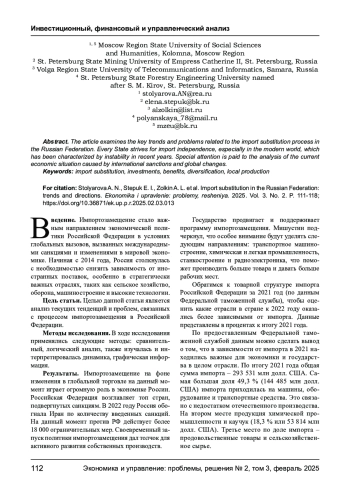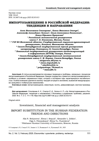 СТОЛЯРОВА А. Н., СТЕПУК Е. И., ЗОЛКИН А. Л., ПОЛЯНСКАЯ О. А., ПУЗЕНКОВА Е. Ю. ИМПОРТОЗАМЕЩЕНИЕ В РОССИЙСКОЙ ФЕДЕРАЦИИ: ТЕНДЕНЦИИ И НАПРАВЛЕНИЯ // ЭКОНОМИКА И УПРАВЛЕНИЕ: ПРОБЛЕМЫ, РЕШЕНИЯ. 2025. ТОМ 3 № 2